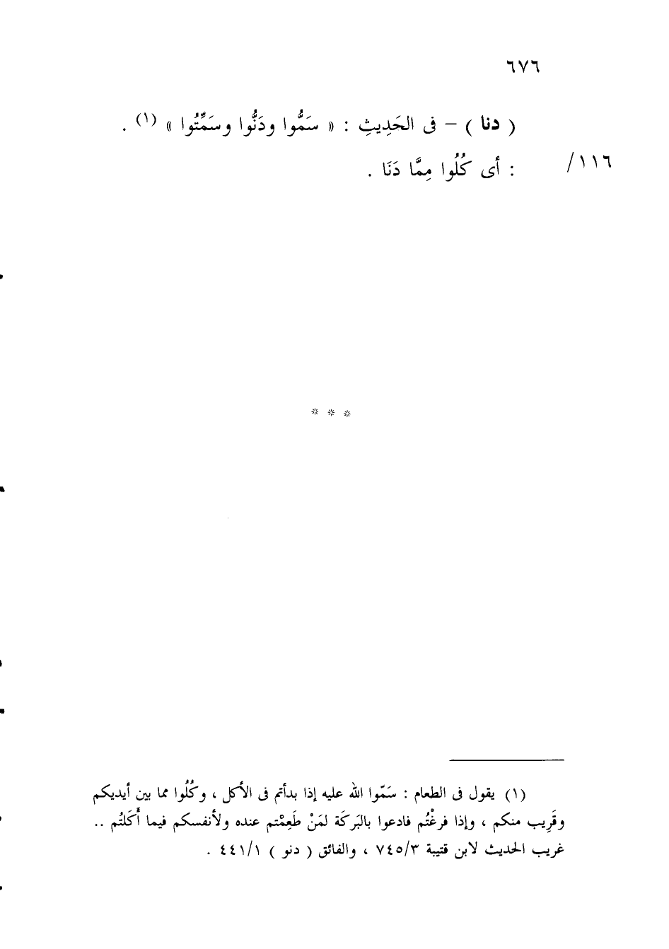 (¬1) يقول في الطعام: سَمّوا الله عليه إذا بدأتم في الأكل، وكُلُوا مما بين أيديكم وقَرِيب منكم، وإذا فرغْتُم فادعوا بالبَركَة لمَنْ طَعِمْتم عنده ولأنفسكم فيما أَكَلتُم .. غريب الحديث لابن قتيبة 3/ 745، والفائق (دنو) 1/ 441.