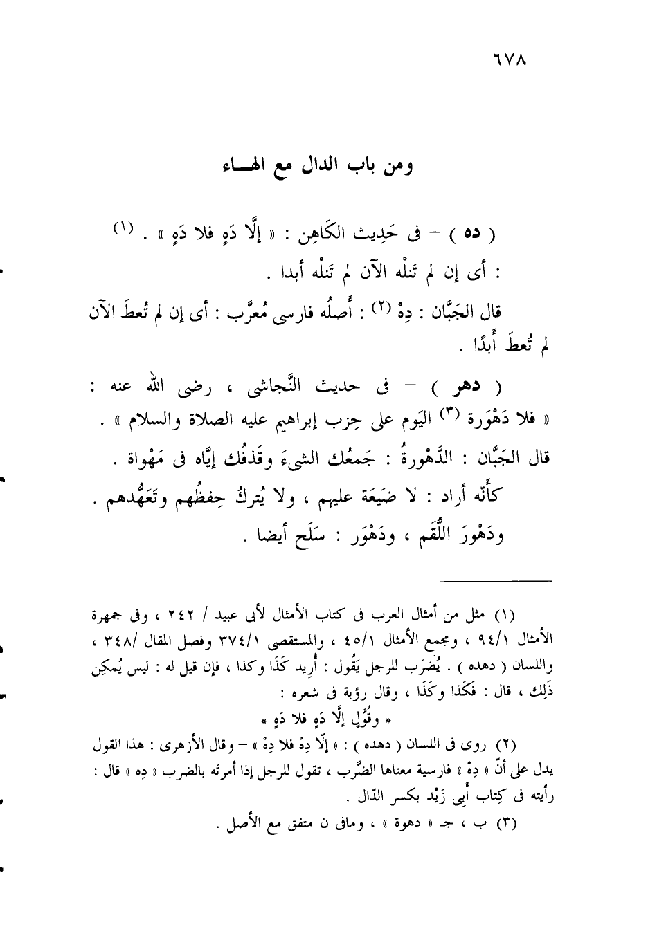 (¬2) روى في اللسان (دهده): "إلَّا دِهْ فلا دِهْ" - وقال الأزهرى: هذا القول يدل على أنّ "دِهْ" فارسية معناها الضَّرب، تقول للرجل إذا أمرتَه بالضرب "دِه" قال: رأيته في كِتاب أَبِي زَيْد بكسر الدّال.