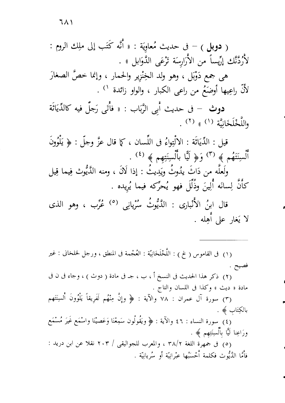 قيل: الدِّيَاثَة: الالْتِواءُ في اللِّسان، كما قال عزَّ وجلّ: {يَلْوُونَ أَلْسِنَتَهُمْ} (¬3) وَ {لَيًّا بِأَلْسِنَتِهِمْ} (¬4).