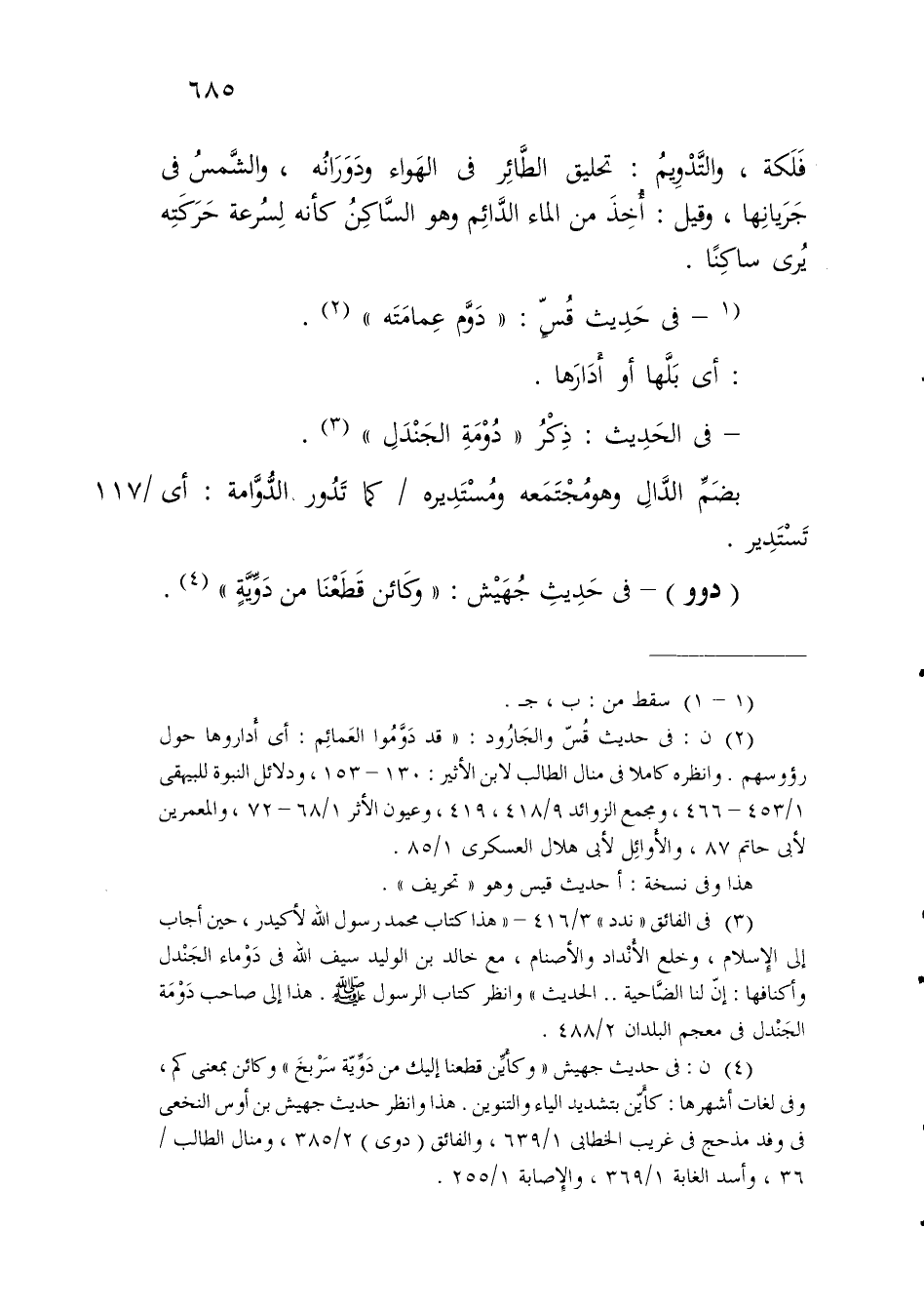 (¬2) ن: في حديث قُسّ والجَارُود: "قد دوَّمُوا العَمائِم: أي أَداروها حول رؤوسهم. وانظره كاملا في منال الطالب لابن الأثير: 130 - 153، ودلائل النبوة للبيهقي 1/ 453 - 466، ومجمع الزوائد 9/ 418، 419، وعيون الأثر 1/ 68 - 72، والمعمرين لأبي حاتم 87، والأَوائِل لأبي هلال العسكري 1/ 85.