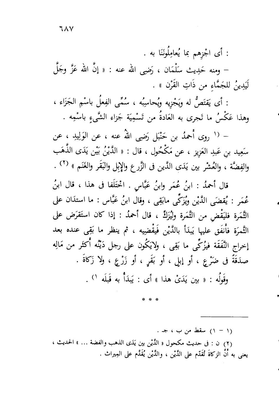 (¬2) ن: في حديث مكحول "الدَّيْن بين يَدَى الذهب والفضة ... " الحديث، يعني به أن الزكاةَ تُقَدّم على الدَّيْن، والدَّيْن يُقَدَّم على المِيراث.
