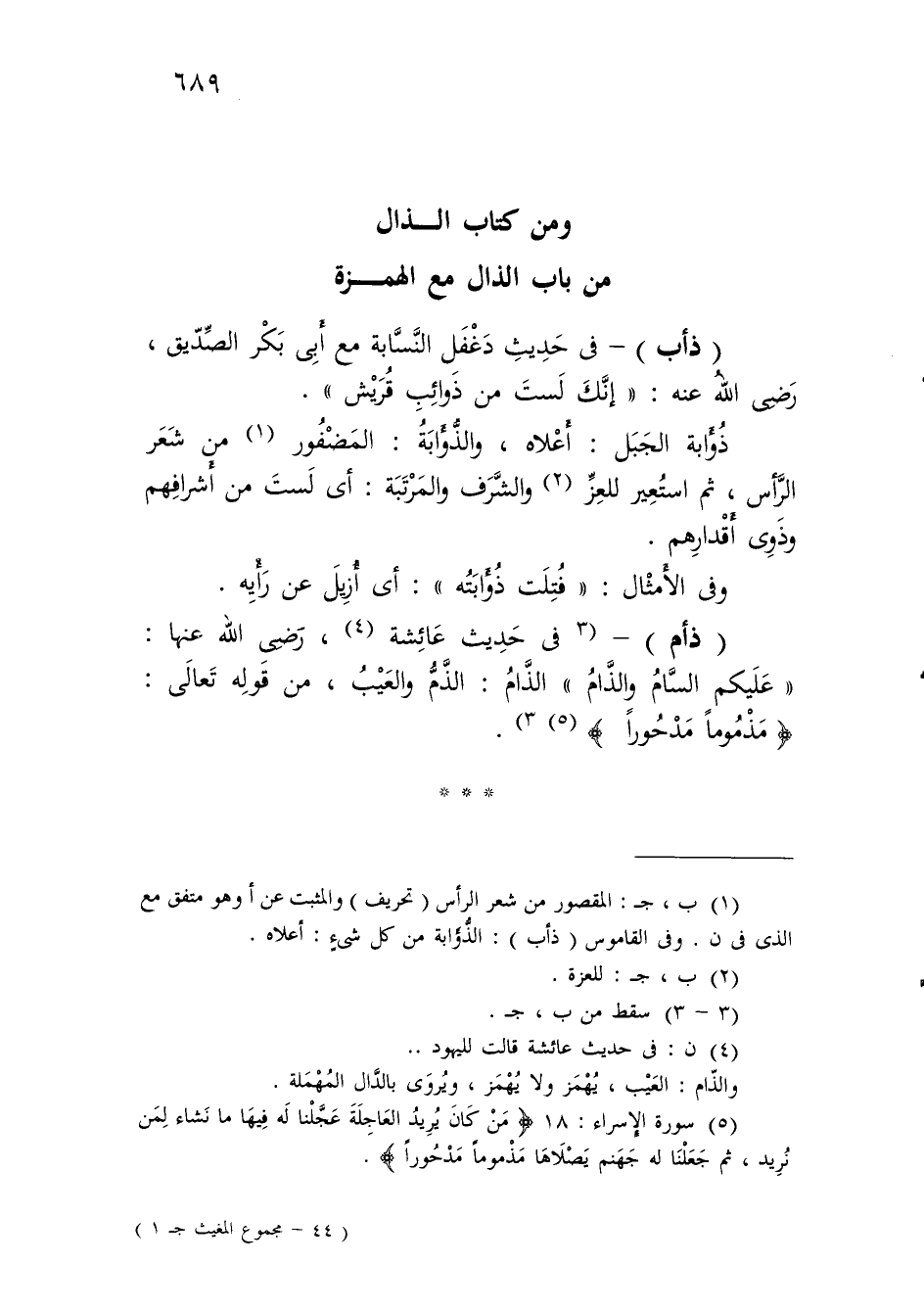 (ذأم) - (3 في حَدِيث عَائِشة (¬4)، رَضى الله عنها: "عَلَيكم السَّامُ والذَّامُ" الذَّامُ: الذَّمُّ والعَيْبُ، من قَولِه تَعالَى: {مَذْمُومًا مَدْحُورًا} (¬5) 3).
