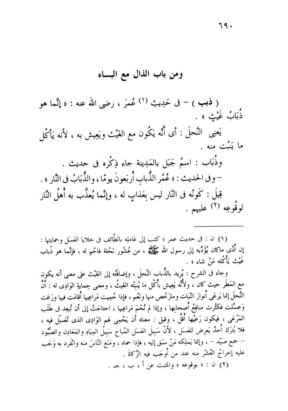 (¬1) ن: في حديث عمر "كتب إلى عَاملِه بالطَّائف في خلايا العَسَل وحمايتها: إن أَدَّى ما كان يُؤَدِّيه إلى رسول الله - صلى الله عليه وسلم -، من عُشُور نَحْلة فاحْمِ له، فإنَّما هو ذُباب غَيْث يَأْكُله مَنْ شاء".