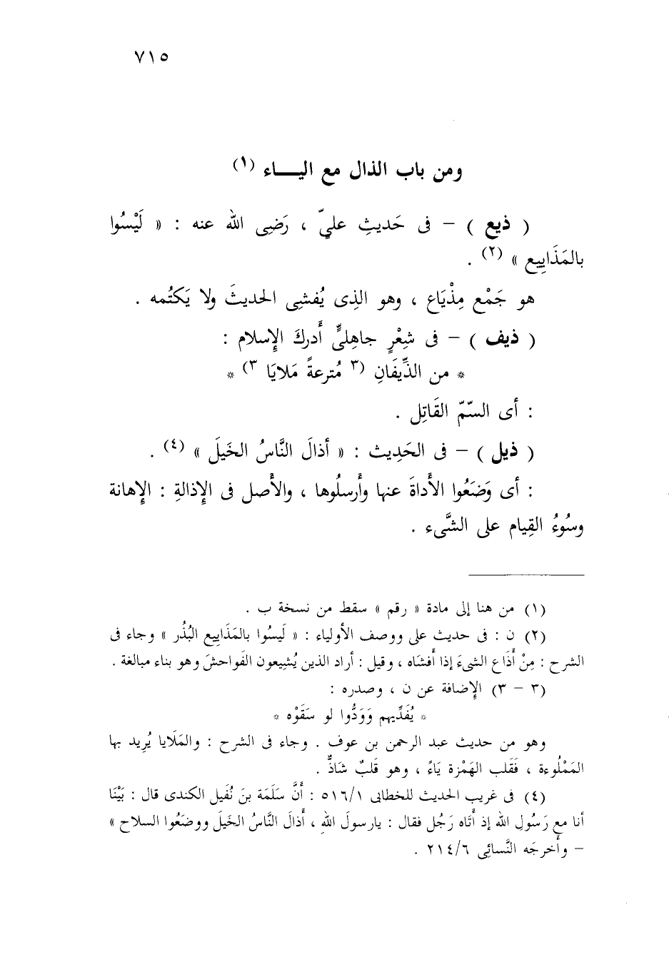 (¬4) في غريب الحديث للخطابي 1/ 516: أَنَّ سَلَمَة بنَ نُفَيل الكندى قال: بَيْنَا أنا مع رَسُول الله إذ أَتَاه رَجُل فقال: يا رسولَ اللهِ، أَذالَ النَّاسُ الخَيلَ ووضَعُوا السلاح" - وأَخرجَه النَّسائِى 6/ 214.