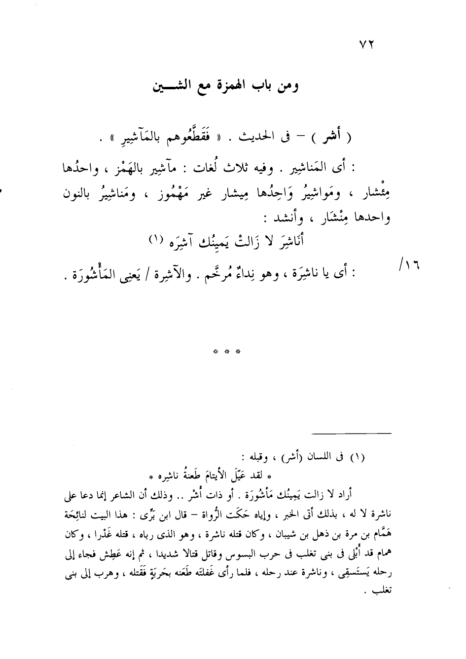 أراد لا زالت يَمِينُك مَأشُورَة. أو ذات أَشْر .. وذلك أن الشاعر إنما دعا على ناشرة لا له، بذلك أتى الخبر، وإياه حَكَت الرُّواة - قال ابن بَرِّى: هذا البيت لنائِحَة هَمّام بن مرة بن ذهل بن شيبان، وكان قتله ناشرة، وهو الذي رباه، قتله غَدْرا، وكان همام قد أَبْلى في بني تغلب في حرب البسوس وقاتل قتالا شديدا، ثم إنه عَطِش فجاء إلى رحله يَستَسقِى، وناشرة عند رحله، فلما رأى غَفلته طَعَنه بحَربَةٍ فَقَتله، وهرب إلى بني تغلب.