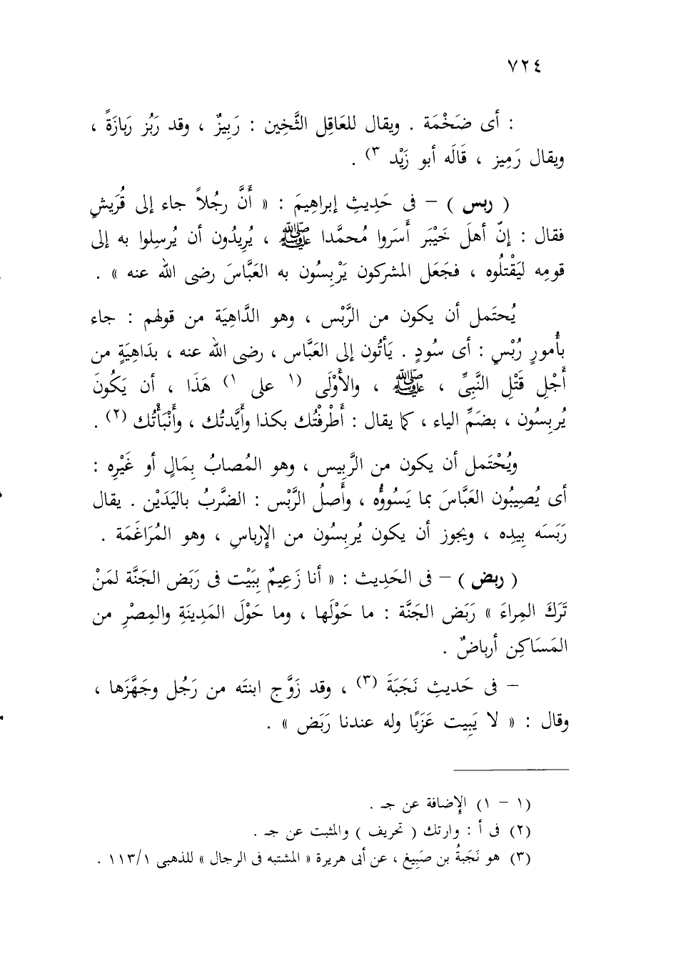 ويُحْتَمل أن يكون من الرَّبيس، وهو المُصابُ بِمَالٍ أو غَيْرِه: أي يُصِيبُون العَبَّاسَ بما يَسُوؤُه، وأَصلُ الرَّبْس: الضَّربُ باليَدَيْن. يقال رَبَسَه بِيدِه، ويجوز أن يكون يُربِسُون من الِإرباسِ، وهو المُرَاغَمَة.