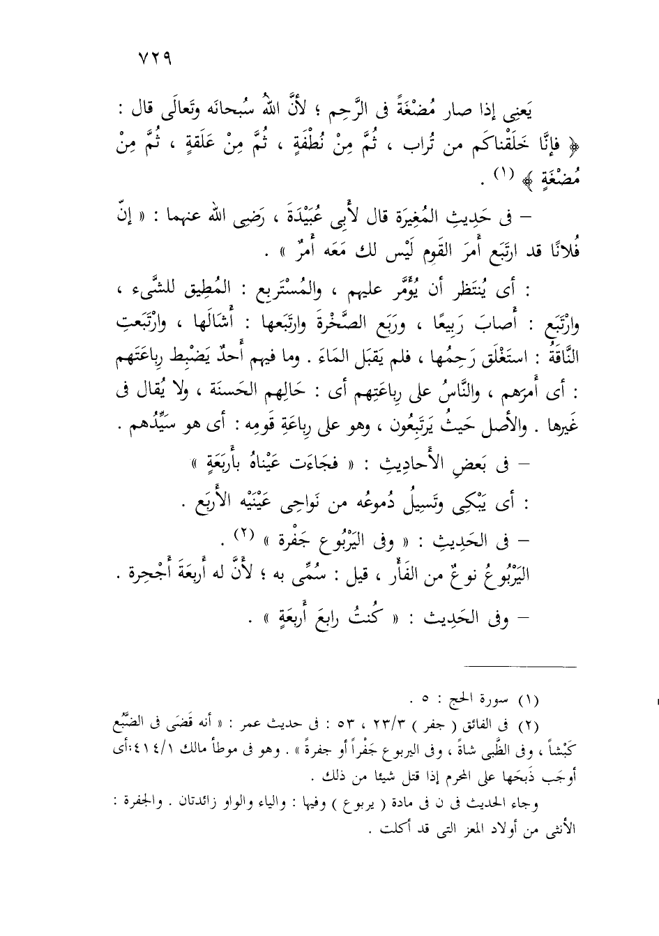 : أي يُنتَظر أن يُؤَمَّر عليهم، والمُسْتَربِع: المُطِيق للشَّىء، وأرْتَبَع: أصابَ رَبِيعًا، ورَبع الصَّخرةَ وارتبَعها: أشَالَها، وارْتَبَعتِ النَّاقَةُ: استَغْلَق رَحِمُها، فلم يَقبَل المَاءَ. وما فيهم أَحدٌ يَضْبِط رِباعَتَهم: أي أمرَهم، والنَّاسُ على رِباعَتِهم أي: حَالِهم الحَسنَة، ولا يُقال في غَيرها. والأصل حَيثُ يَرتَبِعُون، وهو على رِباعَةِ قَومِه: أي هو سَيِّدُهم.