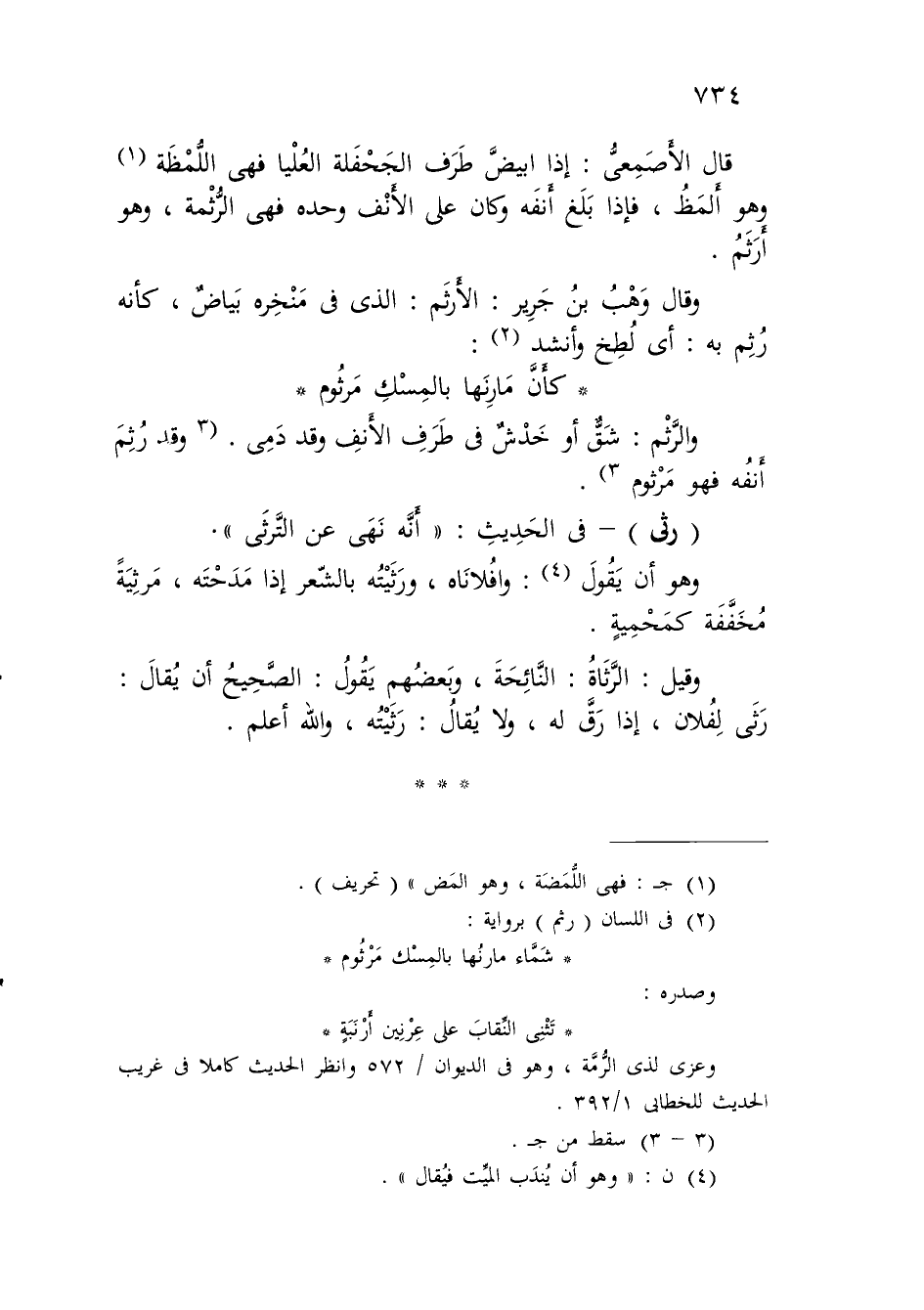 وقال وَهْبُ بنُ جَرِير: الأَرثَم: الذي في مَنْخِره بَياضٌ، كأنه رُثِم به: أي لُطِخ وأنشد (¬2):