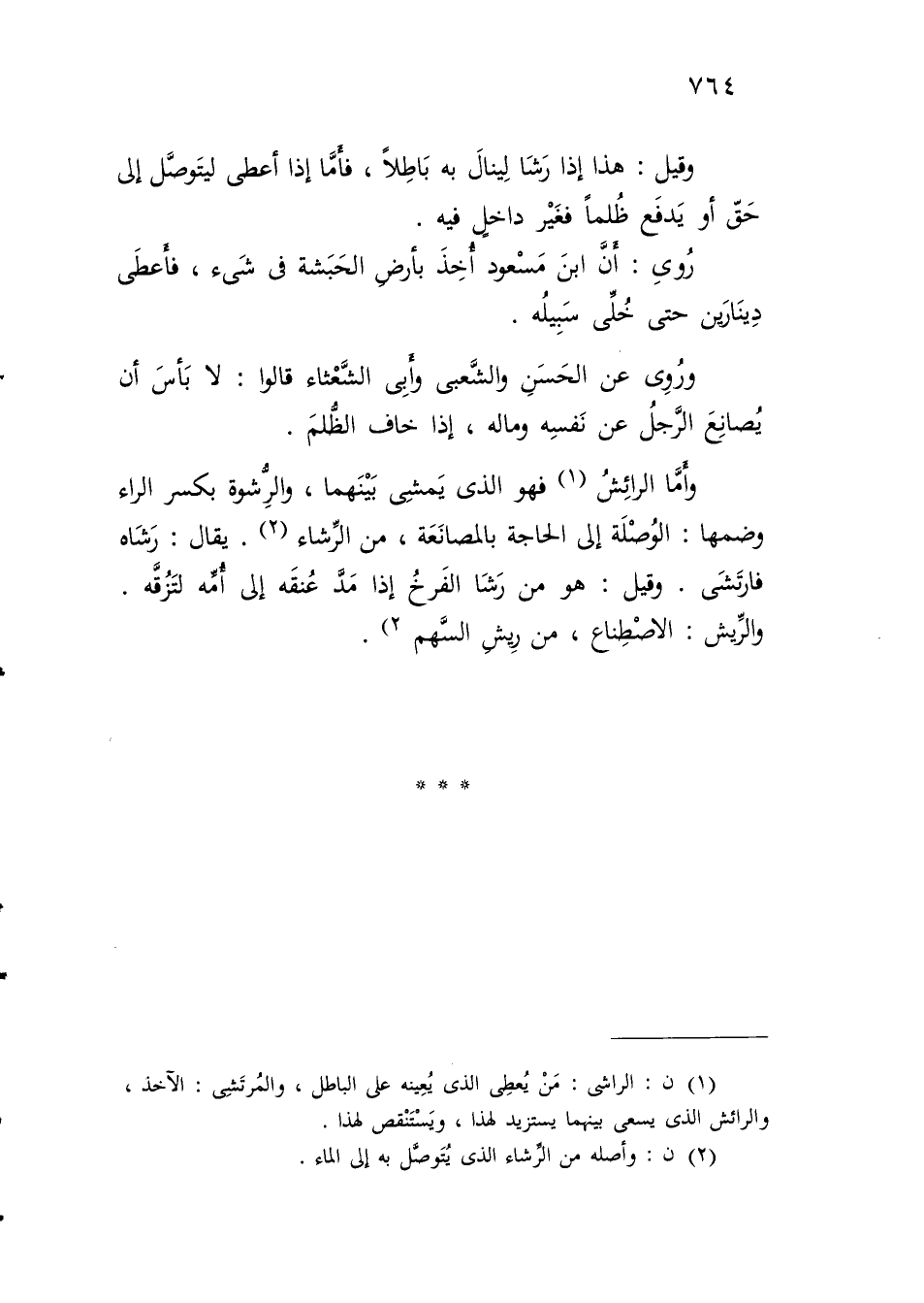 وأمَّا الرائِشُ (¬1) فهو الذي يَمشِى بَيْنَهما، والرُّشوة بكسر الراء وضمها: الوُصلَة إلى الحاجة بالمصانَعَة، من الرِّشاء (¬2). يقال: رَشَاه فارتَشَى. وقيل: هو من رَشَا الفَرخُ إذا مَدَّ عُنقَه إلى أُمَّه لتَزُقَّه. والرَّيش: الاصْطِناع، من رِيشِ السَّهم 2).