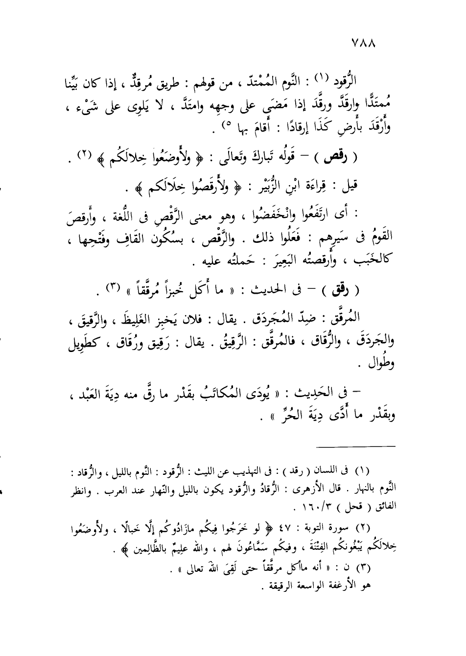 الرُّقود (¬1): النَّوم المُمْتدّ، من قولهم: طريق مُرقِدٌّ، إذا كان بَيِّنا مُمتَدًّا وارقَدَّ ورقَّدَ إذا مَضَى على وجهِه وامتَدَّ، لا يَلوِى على شَىْء، وأَرْقَدَ بأَرضِ كَذَا إرقادًا: أَقامَ بها 5).