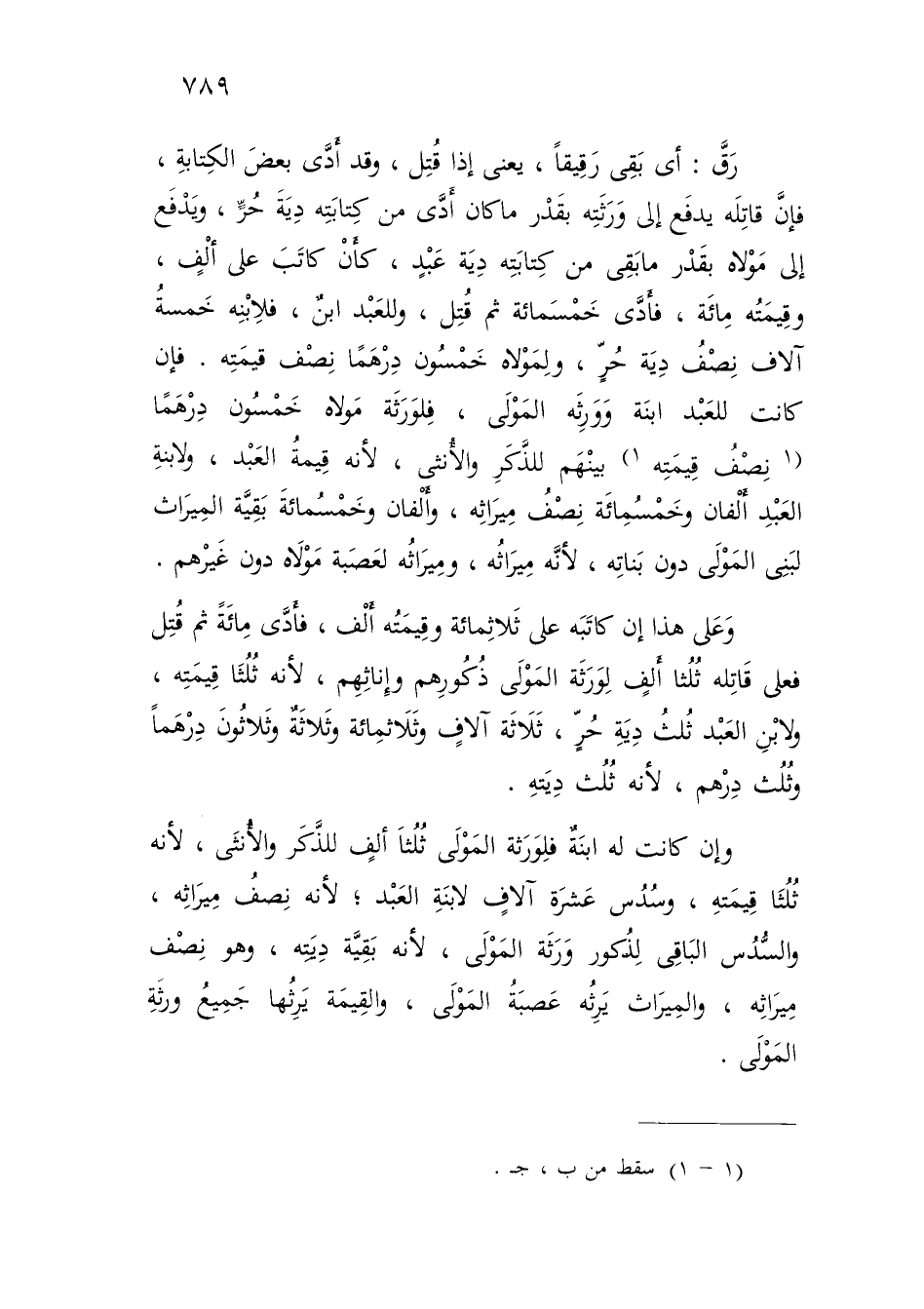 رَقَّ: أي بَقِى رَقِيقاً، يعنى إذا قُتِل، وقد أَدَّى بعضَ الكِتابةِ، فإنَّ قاتِلَه يدفَع إلى وَرَثَتِه بقَدْر ما كان أَدَّى من كِتابَتِه دِيَةَ حُرٍّ، ويَدْفَع إلى مَوْلاه بقَدْر ما بَقِى من كِتابَتِه دِيَة عَبْدٍ، كأَنْ كاتَبَ على ألْفٍ، وقِيمَتُه مِائَة، فأَدَّى خَمسَمائة ثم قُتِل، وللعَبْد ابنٌ، فلاِبْنِه خَمسةُ آلاف نِصْفُ دِيَة حُرٍّ، ولِمَوْلاه خَمسُون دِرْهَمًا نِصف قيمَتِه. فإن كانت للعَبْد ابنَة وَوَرِثَه المَوْلَى، فِلوَرَثَة مَولاه خَمْسُون دِرْهَمًا (1 نِصْفُ قيمَتِه 1) بيْنَهم للذَّكَرِ والأُنثى, لأنه قِيمةُ العَبْد، ولابنةِ العَبْدِ أَلْفان وخَمْسُمِائَة نِصْفُ مِيرَاثِه، وأَلْفان وخَمسُمائةَ بَقِيَّة المِيرَاث لبَنِى المَوْلَى دون بَناتِه، لأنَّه مِيرَاثُه، ومِيراثُه لعَصَبة مَوْلَاه دون غَيْرهم.