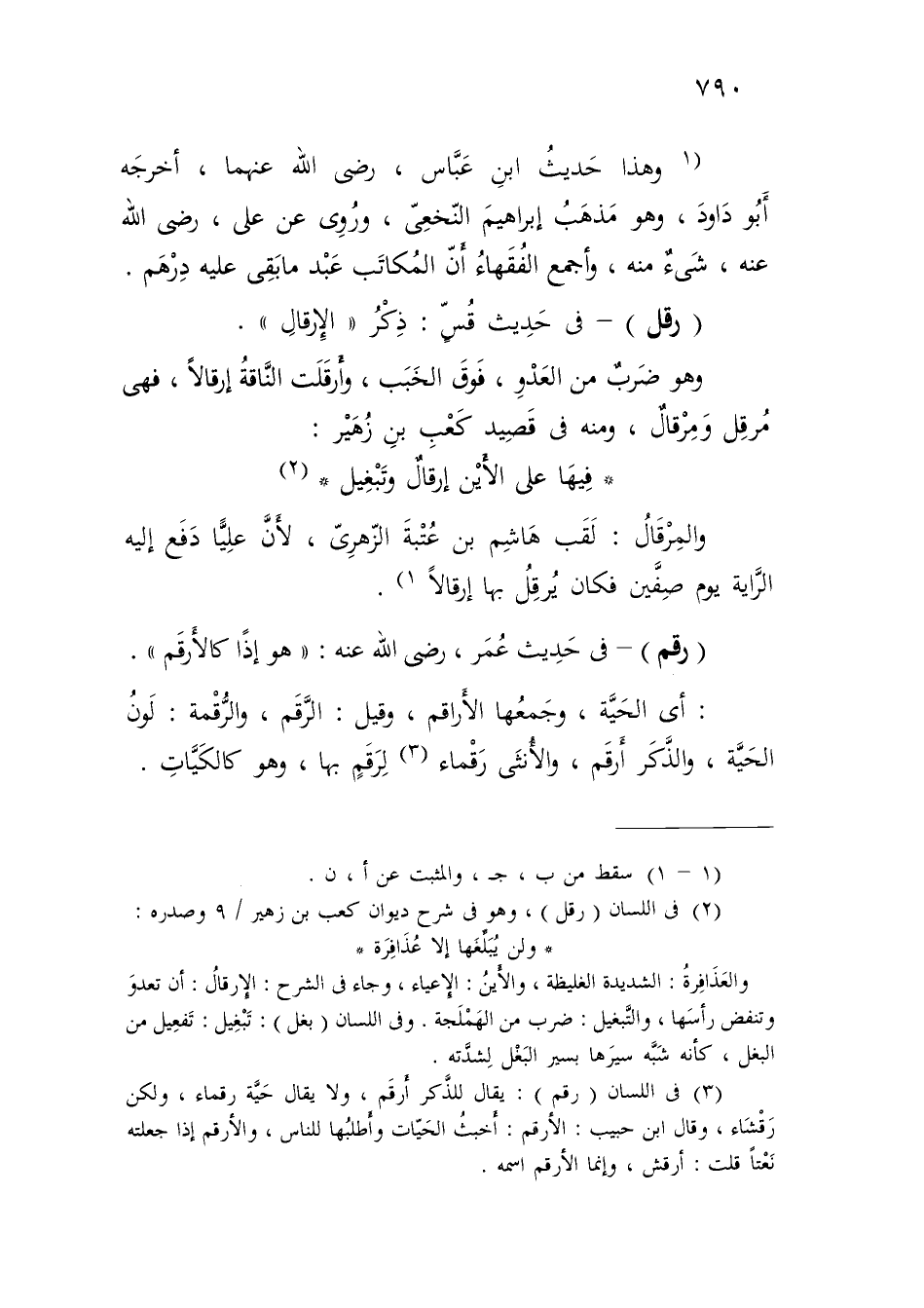 (¬3) في اللسان (رقم): يقال للذَّكر أرقَم، ولا يقال حَيَّة رقماء، ولكن رَقْشَاء، وقال ابن حبيب: الأرقم: أخبثُ الحَيّات واطلبُها للناس، والأرقم إذا جعلته نَعْتاً قلت: أرقش، وإنما الأرقم اسمه.
