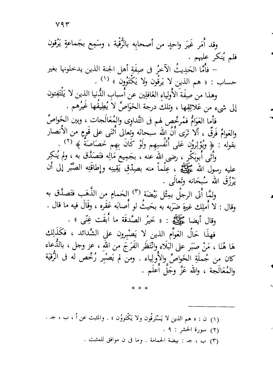 فأما العَوامُّ فمُرخَّص لهم في التَّداوِى والمُعَالَجات، وبين الخَواصِّ والعَوامِّ فَرقٌ، ألا تَرَى أنَّ الله سبحانَه وتعالى أثنَى على قَومٍ من الأنصار بقوله: {ويُؤثِروُن عَلى أنْفُسِهِم ولَوْ كَانَ بِهِم خَصَاصَةٌ} (¬2).