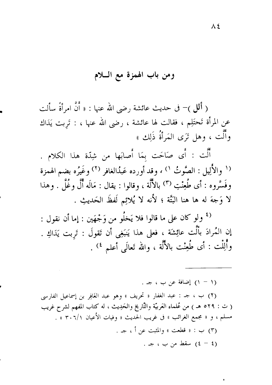 (4 ولو كان على ما قالوا فلا يَخلُو من وَجْهَين: إما أن نقول: إن المُرادَ بألَّت عائِشَة، فعلى هذا يَنبَغِى أن تَقولَ: تَرِبت يَداكِ. وأُلِلْت: أي طُعِنْت بالأَلَّة، والله تَعالَى أعلم 4).