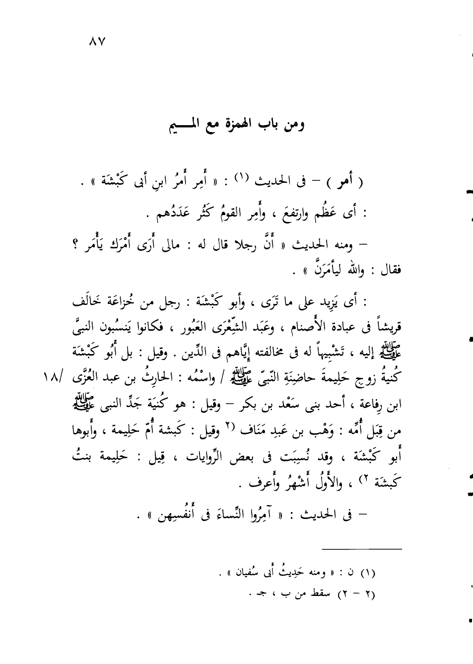 : أي يَزِيد على ما تَرَى، وأبو كَبْشَة: رجل من خُزاعَة خالَف قريشاً في عبادة الأصنام، وعَبَد الشِّعْرَى العَبُور، فكانوا يَنسُبون النبىَّ - صلى الله عليه وسلم - إليه، تَشْبِيهاً له في مخالفته إِيَّاهم في الدِّين. وقيل: بل أَبُو كَبْشَة كُنيةُ زوجِ حَلِيمةَ حاضِنَةِ النّبىّ - صلى الله عليه وسلم - واسْمُه: الحارِث بن عبد العُزَّى ابن رِفاعة، أحد بني سَعْد بن بكر - وقيل: هو كُنيَة جَدِّ النبي - صلى الله عليه وسلم - من قِبَل أُمِّه: وَهْب بن عَبدِ مَناف (2 وقيل: كَبشة أُمّ حَلِيمة، وأبوها أبو كَبْشَة، وقد نُسِبَت في بعض الرِّوايات، قِيل: حَلِيمة بنتُ كَبشَة 2)، والأولُ أشْهرُ وأَعرف.