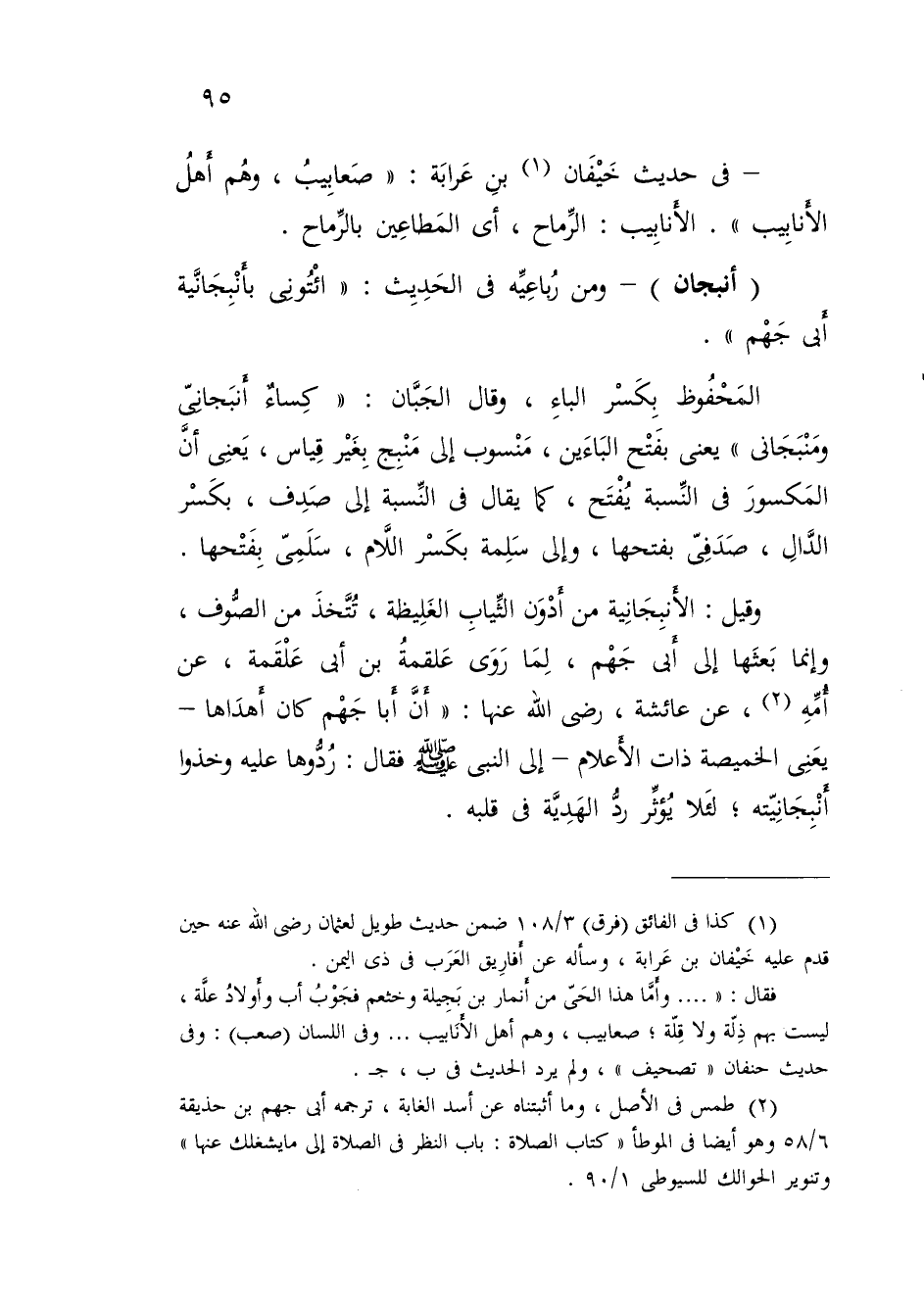 فقال: " .... وأمَّا هذا الحَىّ من أنمار بن بَجِيلة وخثعم فجَوْبُ أب وأَولادُ علَّة، ليست بهم ذِلّة ولا قِلّة؛ صعابيب، وهم أهل الأَنابيب ... وفي اللسان (صعب): وفي حديث حنفان "تصحيف"، ولم يرد الحديث في ب، جـ.