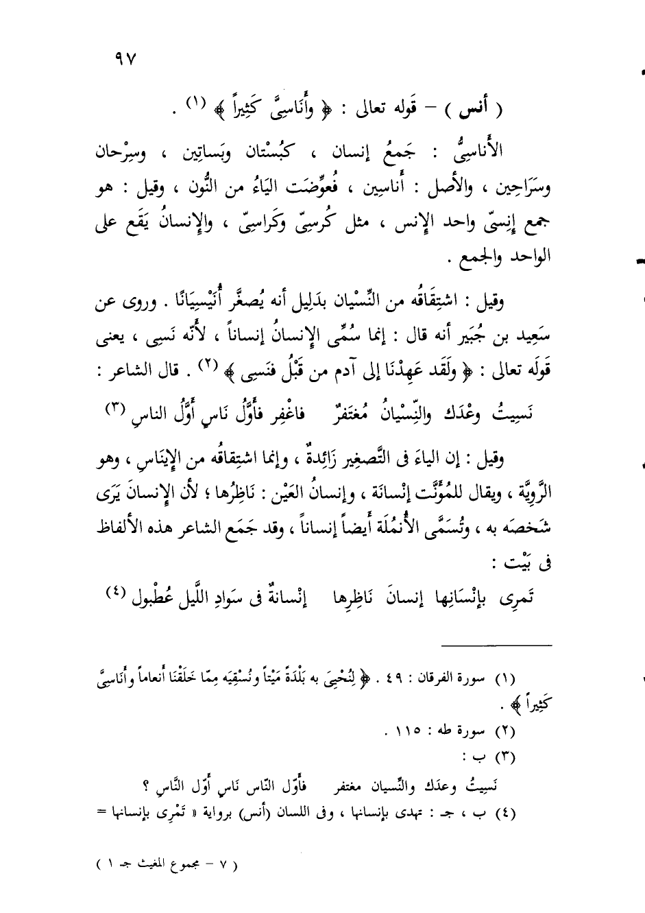 وقيل: اشتِقَاقُه من النِّسْيان بدَلِيل أنَّه يُصغَّر أُنَيْسِيَانًا. وروى عن سَعِيد بن جُبَير أنَّه قال: إنما سُمَّى الِإنسانُ إنسانًا، لأَنّه نَسِى، يعني قَولَه تعالى: {وَلَقَدْ عَهِدْنَا إِلَى آدَمَ مِنْ قَبْلُ فَنَسِيَ} (¬2). قال الشاعر: