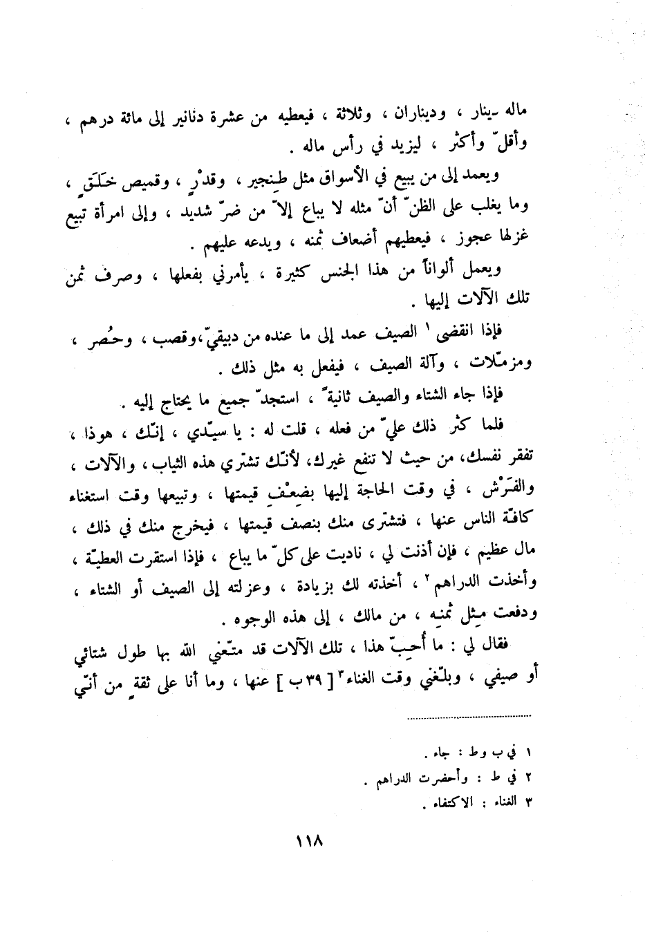 فقال لي: ما أحبّ هذا، تلك الآلات قد متّعني الله بها طول شتائي أو صيفي، وبلّغني وقت الغناء «3» [39 ب] عنها، وما أنا على ثقة من أنّي