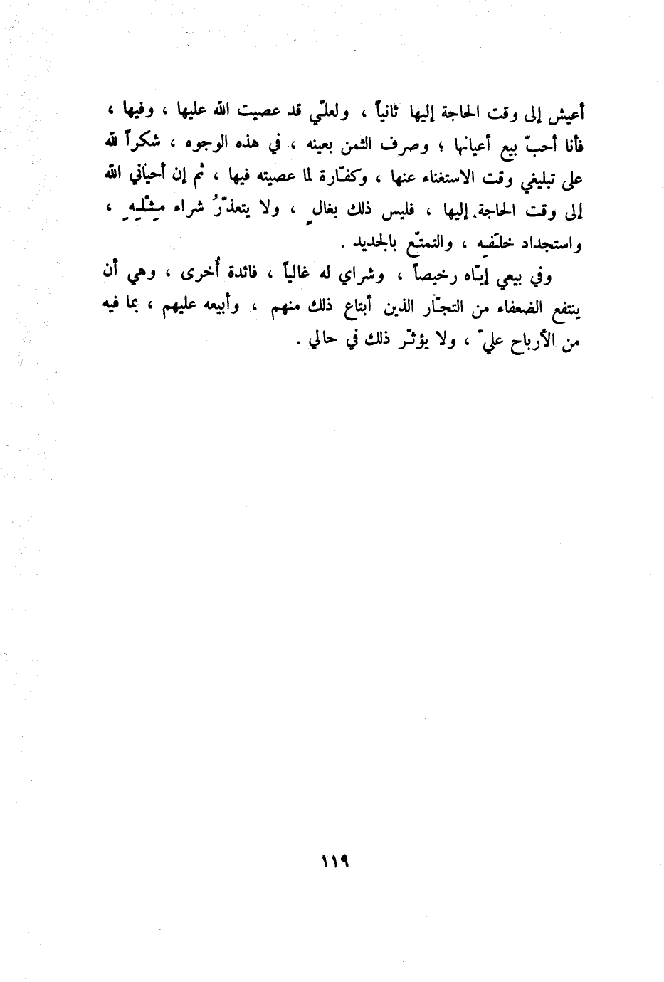 وفي بيعي إيّاه رخيصا، وشراي له غاليا، فائدة أخرى، وهي أن ينتفع الضعفاء من التجّار الذين أبتاع ذلك منهم، وأبيعه عليهم، بما فيه من الأرباح عليّ، ولا يؤثّر ذلك في حالي.