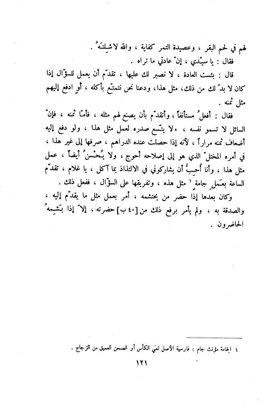فقال: أفعل مستأنفا، وأتقدّم بأن يصنع لهم مثله، فأمّا ثمنه، فإنّ السائل لا تسمو نفسه، ولا يتّسع صدره لعمل مثل هذا، ولو دفع إليه أضعاف ثمنه مرارا، لأنه إذا حصلت عنده الدراهم، صرفها إلى غير هذا، في أمره المختلّ الذي هو إلى إصلاحه أحوج، ولا يحسن أيضا، عمل مثل هذا، وأنا أحبّ أن يشاركوني في الالتذاذ بما آكل، يا غلام، تقدّم الساعة بعمل جامة «1» مثل هذه، وتفريقها على السؤّال، ففعل ذلك.