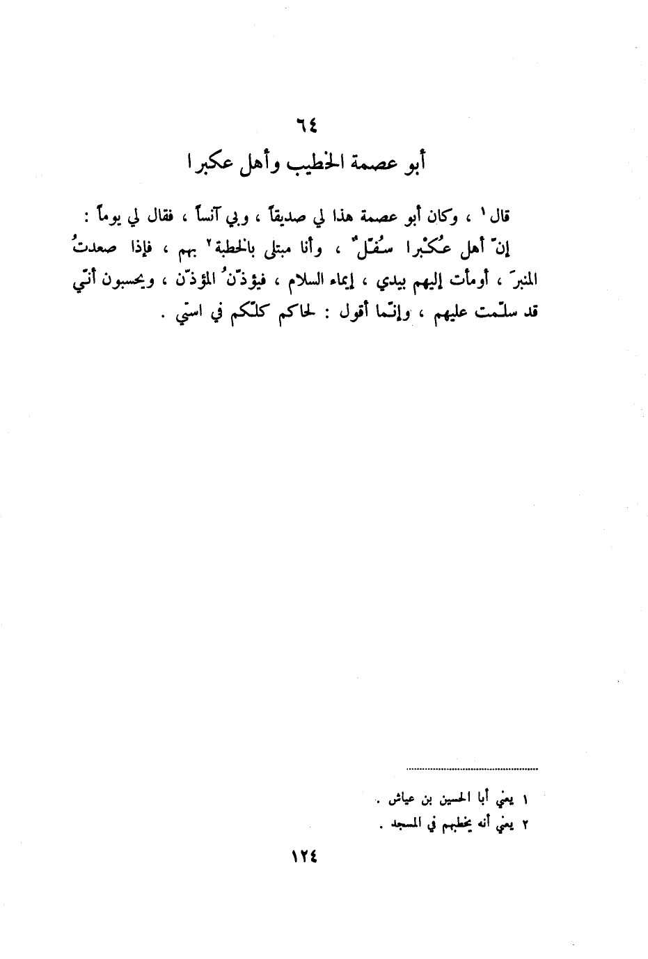 إنّ أهل عكبرا سفّل، وأنا مبتلى بالخطبة «2» بهم، فإذا صعدت المنبر، أو مأت إليهم بيدي، إيماء السلام، فيؤذّن المؤذّن، ويحسبون أنّي قد سلّمت عليهم، وإنّما أقول: لحاكم كلّكم في استي.