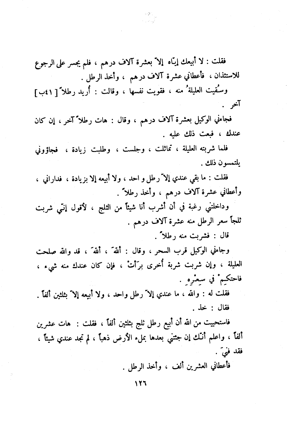 فقلت: ما بقي عندي إلّا رطل واحد، ولا أبيعه إلا بزيادة، فداراني، وأعطاني عشرة آلاف درهم، وأخذ رطلا.