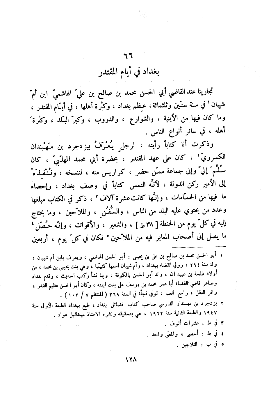 وذكرت أنا كتابا رأيته، لرجل يعرف بيزدجرد بن مهبندان الكسرويّ «2» ، كان على عهد المقتدر، بحضرة أبي محمد المهلّبيّ، كان سلّم إليّ وإلى جماعة ممّن حضر، كراريس منه، لننسخه، وننفذه إلى الأمير ركن الدولة، لأنّه التمس كتابا في وصف بغداد، وإحصاء ما فيها من الحمّامات، وإنّها كانت عشرة آلاف «3» ، ذكر في الكتاب مبلغها وعدد من يحتوي عليه البلد من الناس، والسّفن، والملّاحين، وما يحتاج إليه في كلّ يوم من الحنطة [38 ط] ، والشعير، والأقوات، وإنّه حصّل «4» ما يصل إلى أصحاب المعابر فيه من الملّاحين «5» فكان في كلّ يوم، أربعين