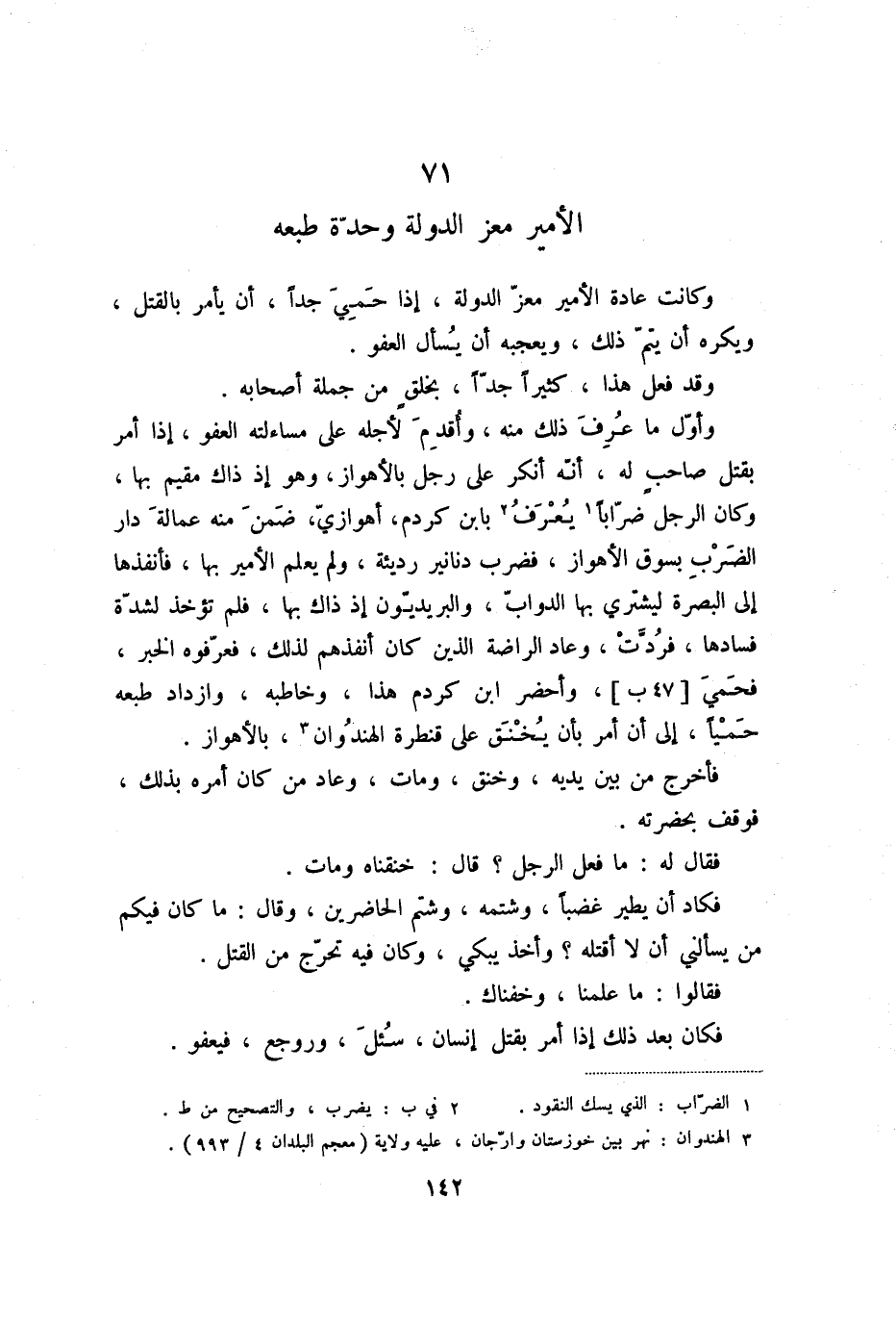 وكانت عادة الأمير معزّ الدولة، إذا حمي جدا، أن يأمر بالقتل، ويكره أن يتمّ ذلك، ويعجبه أن يسأل العفو.
