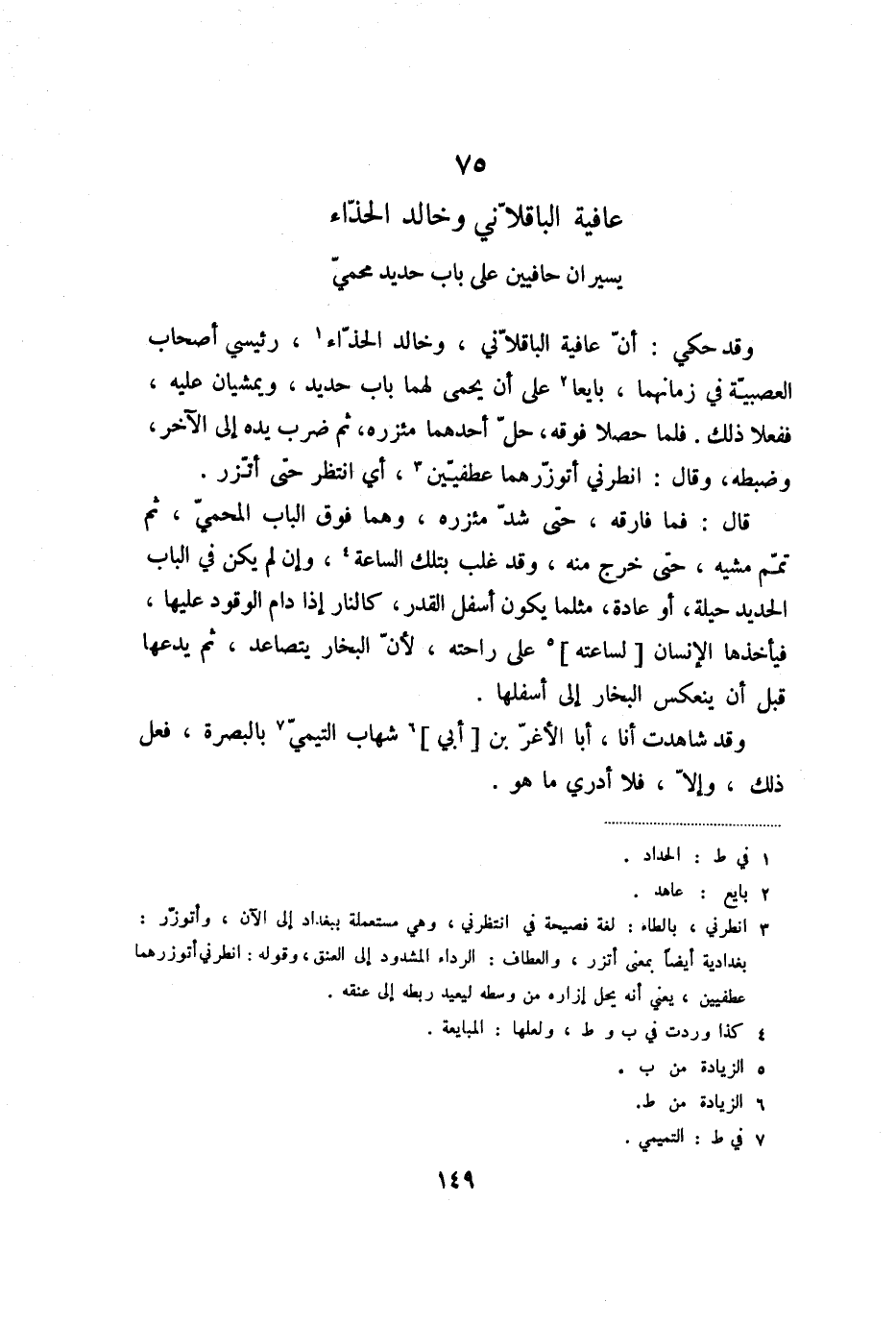 وقد حكي: أنّ عافية الباقلّاني، وخالد الحذّاء «1» ، رئيسي أصحاب العصبيّة في زمانهما، بايعا «2» على أن يحمى لهما باب حديد، ويمشيان عليه، ففعلا ذلك. فلما حصلا فوقه، حلّ أحدهما مئزره، ثم ضرب يده إلى الآخر، وضبطه، وقال: انطرني أتوزّرهما عطفيّين «3» ، أي انتظر حتى أتّزر.