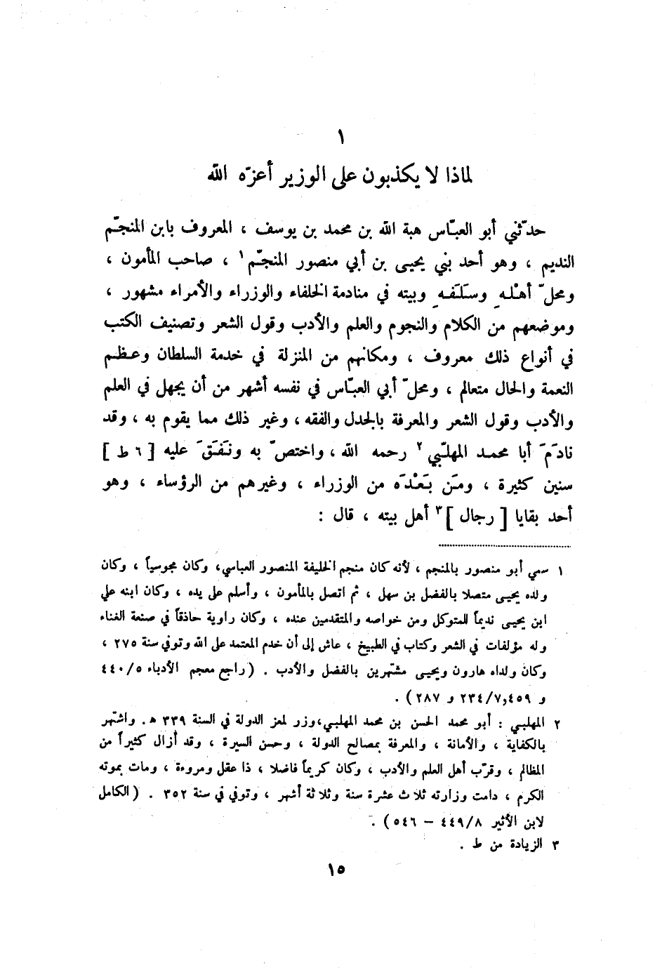 حدّثني أبو العبّاس هبة الله بن محمد بن يوسف، المعروف بابن المنجّم النديم، وهو أحد بني يحيى بن أبي منصور المنجّم «1» ، صاحب المأمون، ومحلّ أهله وسلفه وبيته في منادمة الخلفاء والوزراء والأمراء مشهور، وموضعهم من الكلام والنجوم والعلم والأدب وقول الشعر وتصنيف الكتب في أنواع ذلك معروف، ومكانهم من المنزلة في خدمة السلطان وعظم النعمة والحال متعالم، ومحلّ أبي العبّاس في نفسه أشهر من أن يجهل في العلم والأدب وقول الشعر والمعرفة بالجدل والفقه، وغير ذلك مما يقوم به، وقد نادم أبا محمد المهلّبي «2» رحمه الله، واختصّ به ونفق عليه [6 ط] سنين كثيرة، ومن بعده من الوزراء، وغيرهم من الرؤساء، وهو أحد بقايا [رجال] «3» أهل بيته، قال: