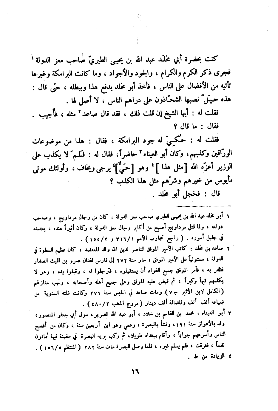كنت بحضرة أبي مخلد عبد الله بن يحيى الطبريّ صاحب معز الدولة «1» فجرى ذكر الكرم والكرام، والجود والأجواد، وما كانت البرامكة وغيرها تأتيه من الأفضال على الناس، فأخذ أبو مخلد يدفع هذا ويبطله، حتى قال: