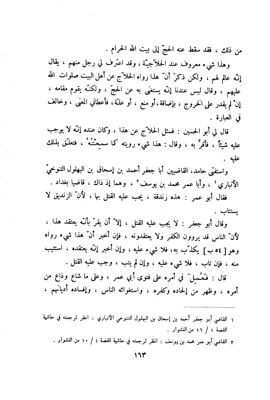 واستفتى حامد، القاضيين أبا جعفر أحمد بن إسحاق بن البهلول التنوخيّ الأنباري «1» ، وأبا عمر محمد بن يوسف «2» ، وهما إذ ذاك، قاضيا بغداد.