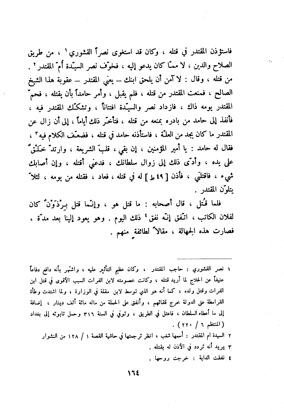 من قتله، وقال: لا آمن أن يلحق ابنك- يعني المقتدر- عقوبة هذا الشيخ الصالح، فمنعت المقتدر من قتله، فلم يقبل، وأمر حامدا بأن يقتله، فحمّ المقتدر يومه ذاك، فازداد نصر والسيّدة افتتانا، وتشكّك المقتدر فيه، فأنفذ إلى حامد من بادره بمنعه من قتله، فتأخّر ذلك أياما، إلى أن زال عن المقتدر ما كان يجد من العلّة، فاستأذنه حامد في قتله، فضعّف الكلام فيه «3» ، فقال له حامد: يا أمير المؤمنين، إن بقي، قلب الشريعة، وارتدّ خلق على يده، وأدّى ذلك إلى زوال سلطانك، فدعني أقتله، وإن أصابك شيء، فاقتلني، فأذن [49 ط] له في قتله، فعاد، فقتله من يومه، لئلّا يتلوّن المقتدر.