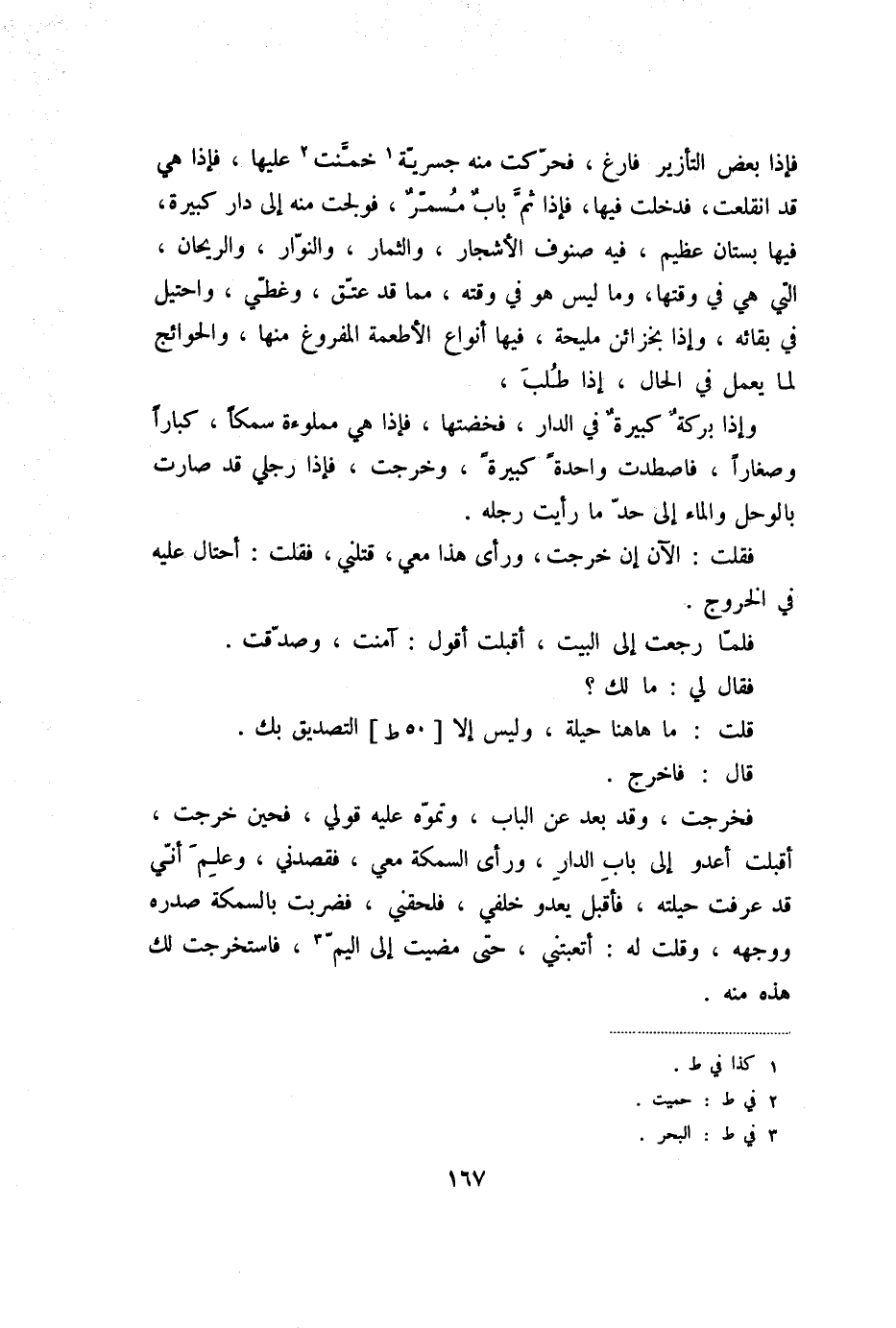 فإذا بعض التأزير فارغ، فحرّكت منه جسريّة «1» خمّنت «2» عليها، فإذا هي قد انقلعت، فدخلت فيها، فإذا ثمّ باب مسمّر، فولجت منه إلى دار كبيرة، فيها بستان عظيم، فيه صنوف الأشجار، والثمار، والنوّار، والريحان، التي هي في وقتها، وما ليس هو في وقته، مما قد عتّق، وغطّي، واحتيل في بقائه، وإذا بخزائن مليحة، فيها أنواع الأطعمة المفروغ منها، والحوائج لما يعمل في الحال، إذا طلب، وإذا بركة كبيرة في الدار، فخضتها، فإذا هي مملوءة سمكا، كبارا وصغارا، فاصطدت واحدة كبيرة، وخرجت، فإذا رجلي قد صارت بالوحل والماء إلى حدّ ما رأيت رجله.