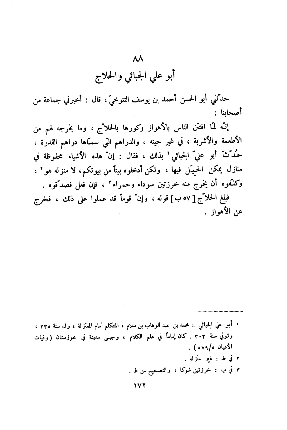 إنّه لمّا افتتن الناس بالأهواز وكورها بالحلّاج، وما يخرجه لهم من الأطعمة والأشربة، في غير حينه، والدراهم التي سمّاها دراهم القدرة، حدّث أبو عليّ الجبائي «1» بذلك، فقال: إنّ هذه الأشياء محفوظة في منازل يمكن الحيل فيها، ولكن أدخلوه بيتا من بيوتكم، لا منزله هو «2» ، وكلّفوه أن يخرج منه خرزتين سوداء وحمراء «3» ، فإن فعل فصدّقوه.