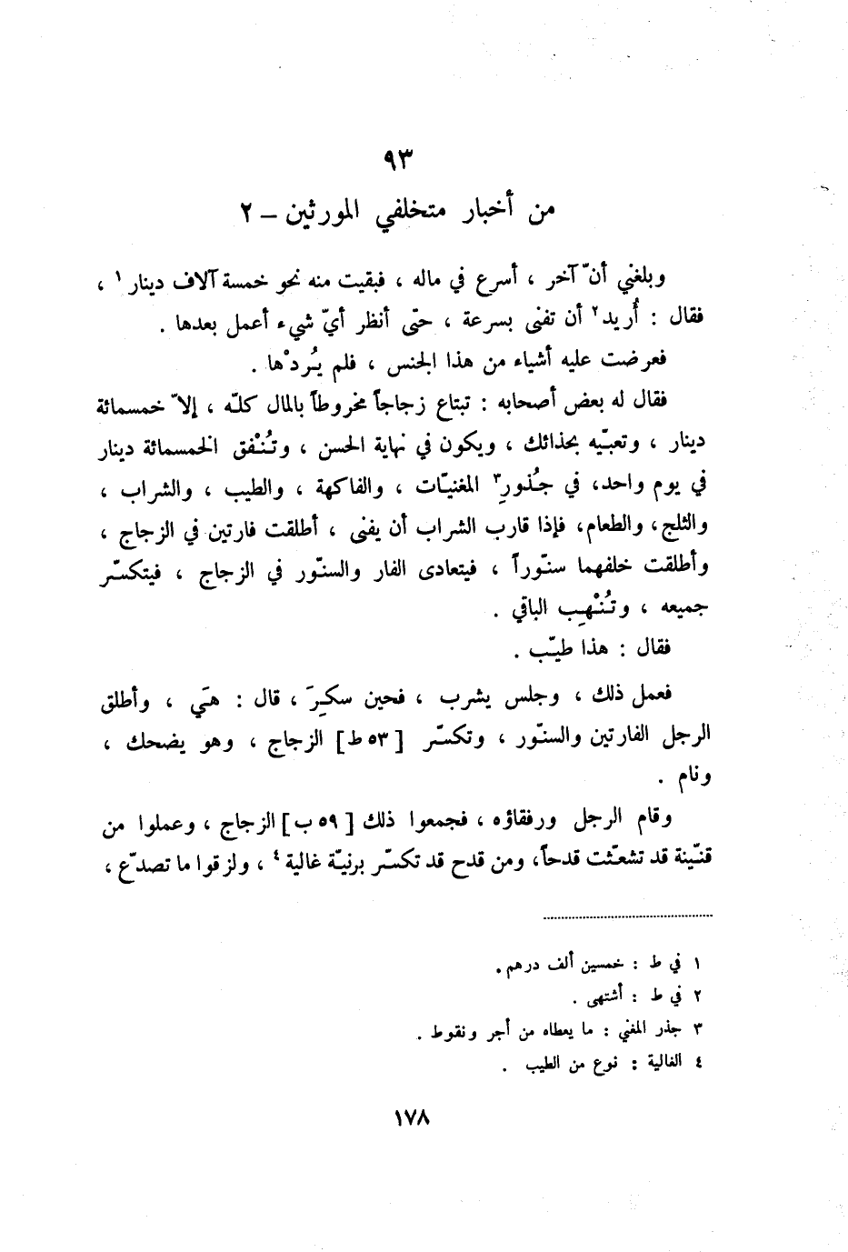 وبلغني أنّ آخر، أسرع في ماله، فبقيت منه نحو خمسة آلاف دينار «1» ، فقال: أريد «2» أن تفنى بسرعة، حتى أنظر أيّ شيء أعمل بعدها.