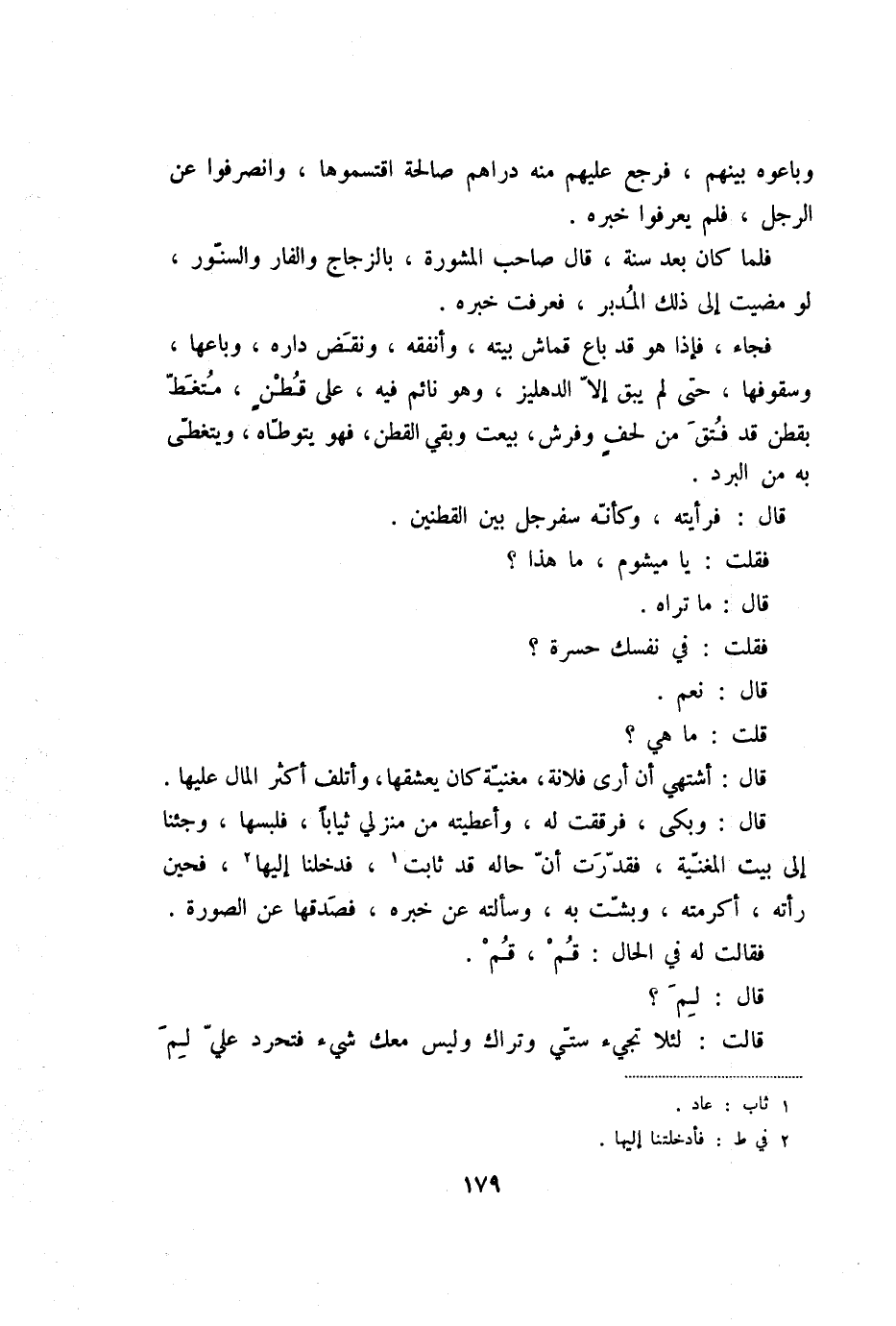 قال: وبكى، فرققت له، وأعطيته من منزلي ثيابا، فلبسها، وجئنا إلى بيت المغنّية، فقدّرت أنّ حاله قد ثابت «1» ، فدخلنا إليها «2» ، فحين رأته، أكرمته، وبشّت به، وسألته عن خبره، فصدقها عن الصورة.