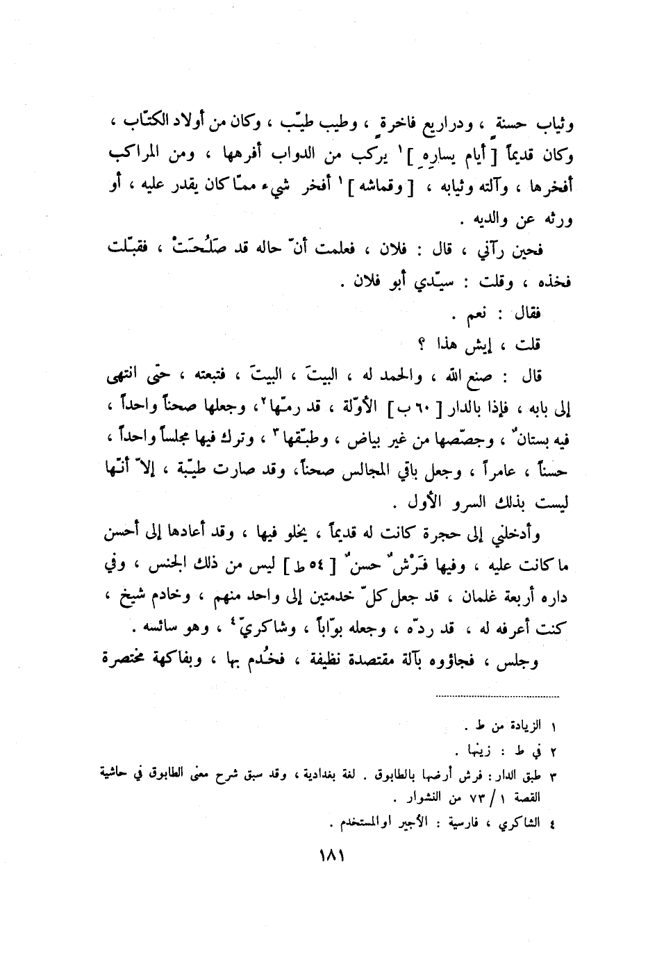 وأدخلني إلى حجرة كانت له قديما، يخلو فيها، وقد أعادها إلى أحسن ما كانت عليه، وفيها فرش حسن [54 ط] ليس من ذلك الجنس، وفي داره أربعة غلمان، قد جعل كلّ خدمتين إلى واحد منهم، وخادم شيخ، كنت أعرفه له، قد ردّه، وجعله بوّابا، وشاكريّ «5» ، وهو سائسه.
