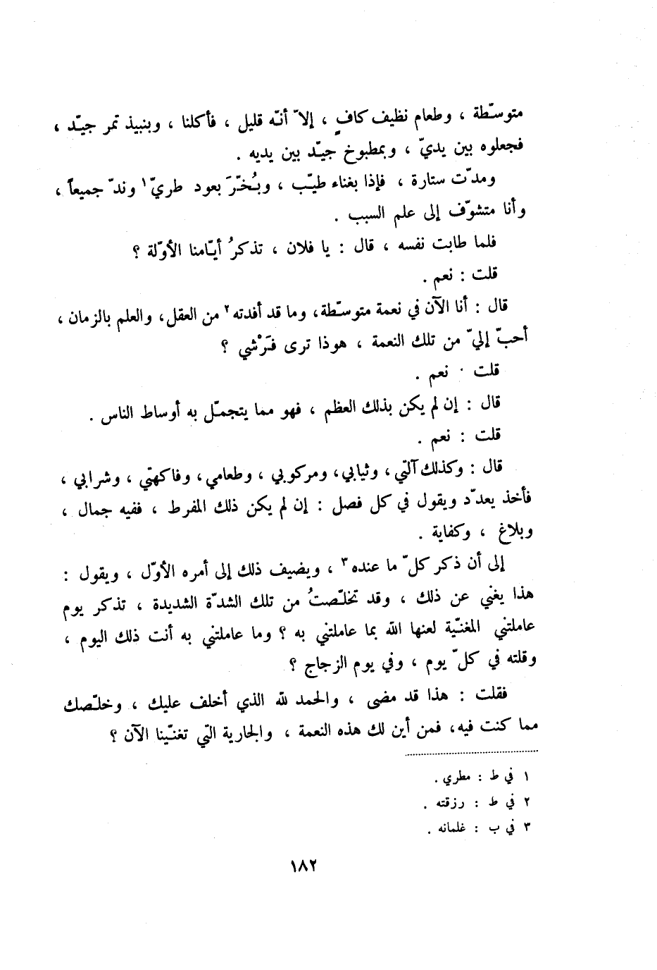 قال: أنا الآن في نعمة متوسّطة، وما قد أفدته «2» من العقل، والعلم بالزمان، أحبّ إليّ من تلك النعمة، هو ذا ترى فرشي؟