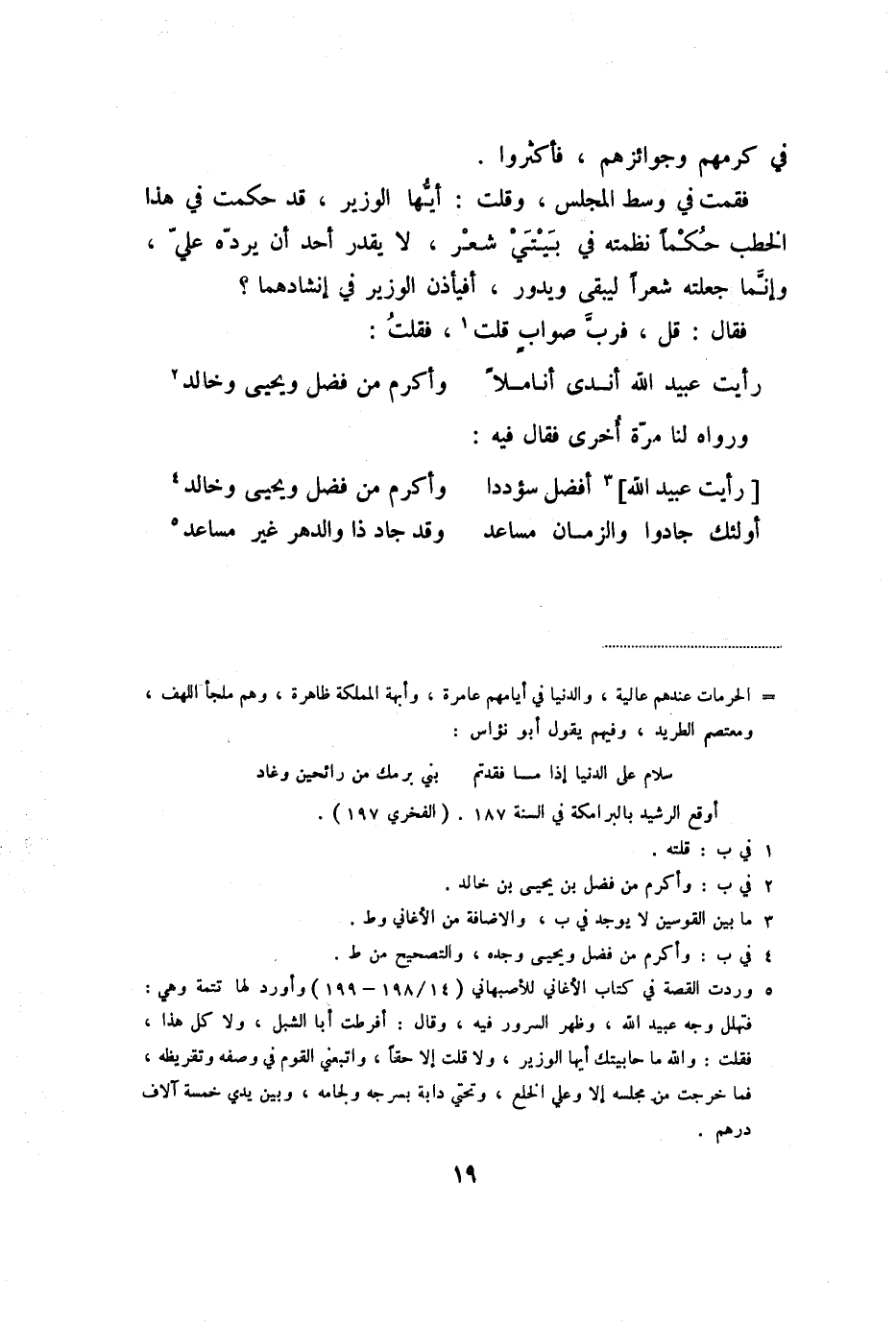 فقمت في وسط المجلس، وقلت: أيّها الوزير، قد حكمت في هذا الخطب حكما نظمته في بيتي شعر، لا يقدر أحد أن يردّه عليّ، وإنّما جعلته شعرا ليبقى ويدور، أفيأذن الوزير في إنشادهما؟
