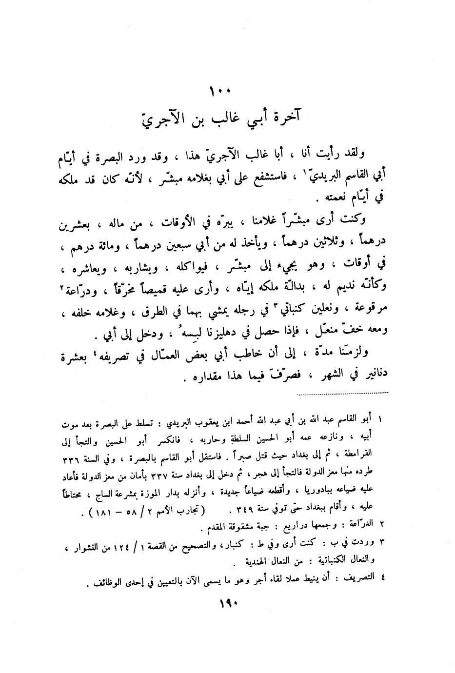 ولقد رأيت أنا، أبا غالب الآجريّ هذا، وقد ورد البصرة في أيّام أبي القاسم البريديّ «1» ، فاستشفع على أبي بغلامه مبشّر، لأنّه كان قد ملكه في أيّام نعمته.