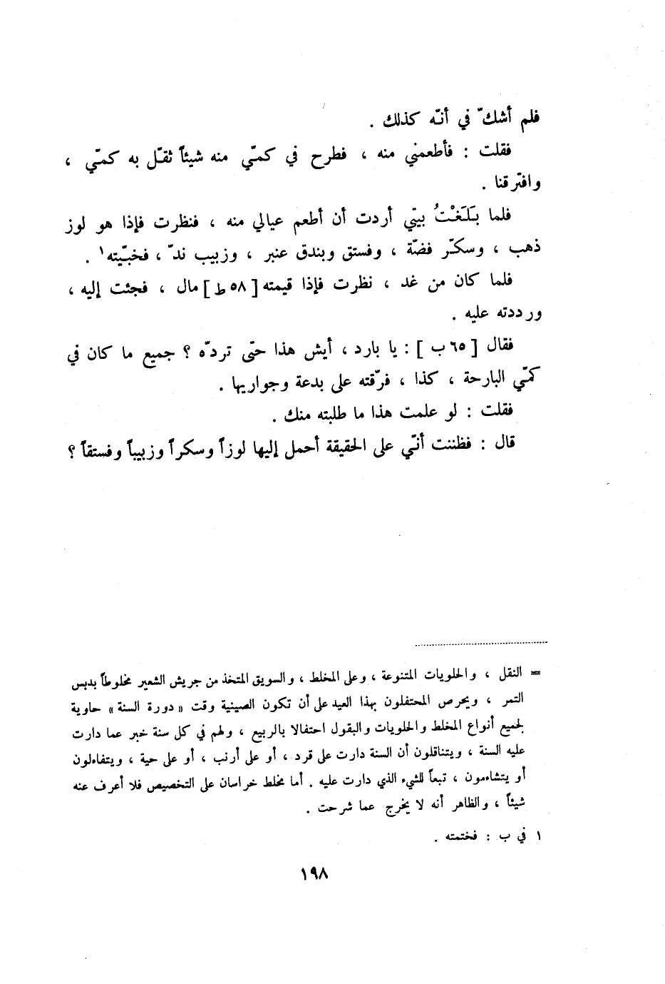 فلما بلغت بيتي أردت أن أطعم عيالي منه، فنظرت فإذا هو لوز ذهب، وسكّر فضّة، وفستق وبندق عنبر، وزبيب ندّ، فخبّيته «1» .