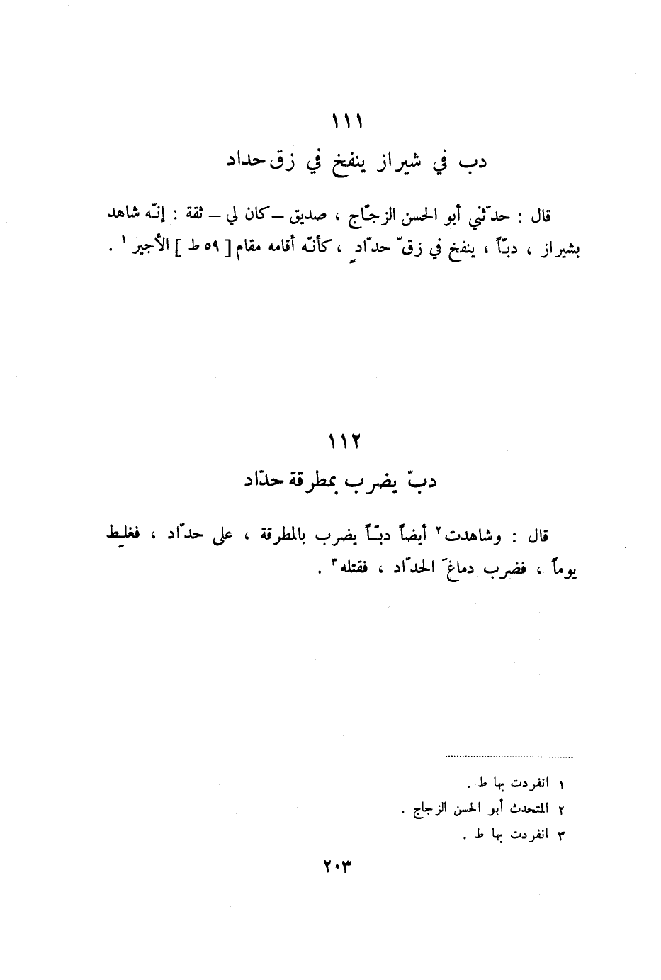 قال: حدّثني أبو الحسن الزجّاج، صديق- كان لي- ثقة: إنّه شاهد بشيراز، دبّا، ينفخ في زقّ حدّاد، كأنّه أقامه مقام [59 ط] الأجير «1» .
