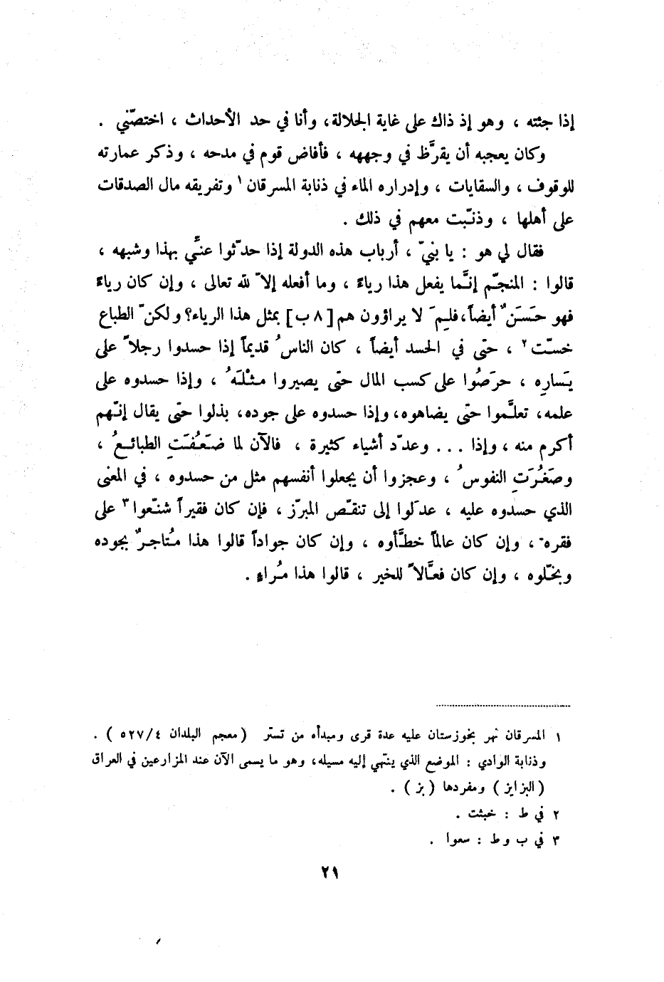فقال لي هو: يا بنيّ، أرباب هذه الدولة إذا حدّثوا عنّي بهذا وشبهه، قالوا: المنجّم إنّما يفعل هذا رياء، وما أفعله إلّا لله تعالى، وإن كان رياء فهو حسن أيضا، فلم لا يراؤون هم [8 ب] بمثل هذا الرياء؟ ولكنّ الطباع خسّت «2» ، حتى في الحسد أيضا، كان الناس قديما إذا حسدوا رجلا على يساره، حرصوا على كسب المال حتى يصيروا مثله، وإذا حسدوه على علمه، تعلّموا حتى يضاهوه، وإذا حسدوه على جوده، بذلوا حتى يقال إنّهم أكرم منه، وإذا ... وعدّد أشياء كثيرة، فالآن لما ضعفت الطبائع، وصغرت النفوس، وعجزوا أن يجعلوا أنفسهم مثل من حسدوه، في المعنى الذي حسدوه عليه، عدلوا إلى تنقّص المبرّز، فإن كان فقيرا شنّعوا «3» على فقره، وإن كان عالما خطّأوه، وإن كان جوادا قالوا هذا متاجر بجوده وبخّلوه، وإن كان فعّالا للخير، قالوا هذا مراء.