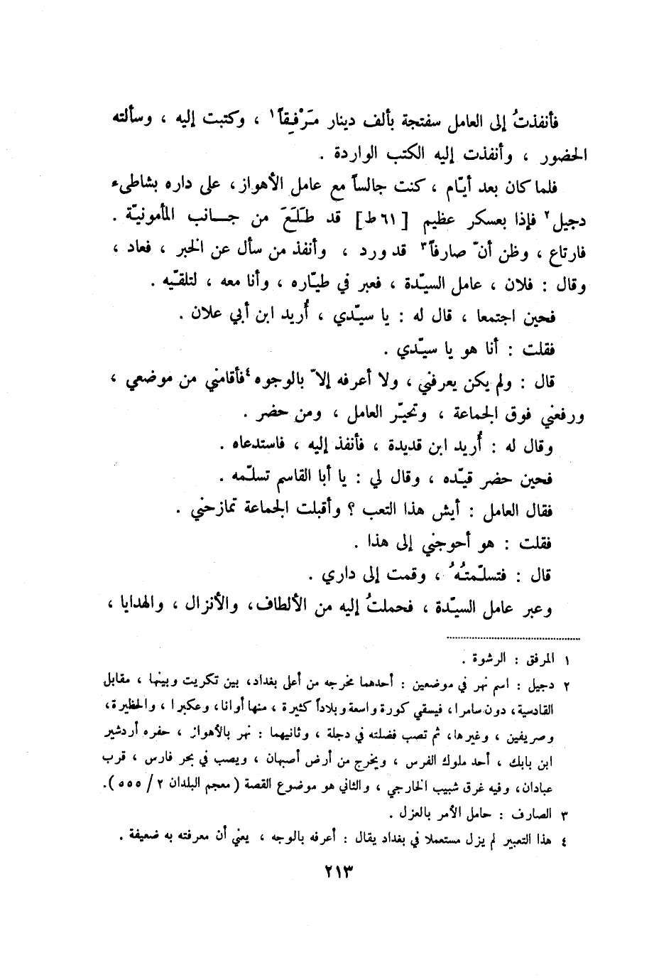 فلما كان بعد أيّام، كنت جالسا مع عامل الأهواز، على داره بشاطىء دجيل «2» فإذا بعسكر عظيم [61 ط] قد طلع من جانب المأمونيّة.
