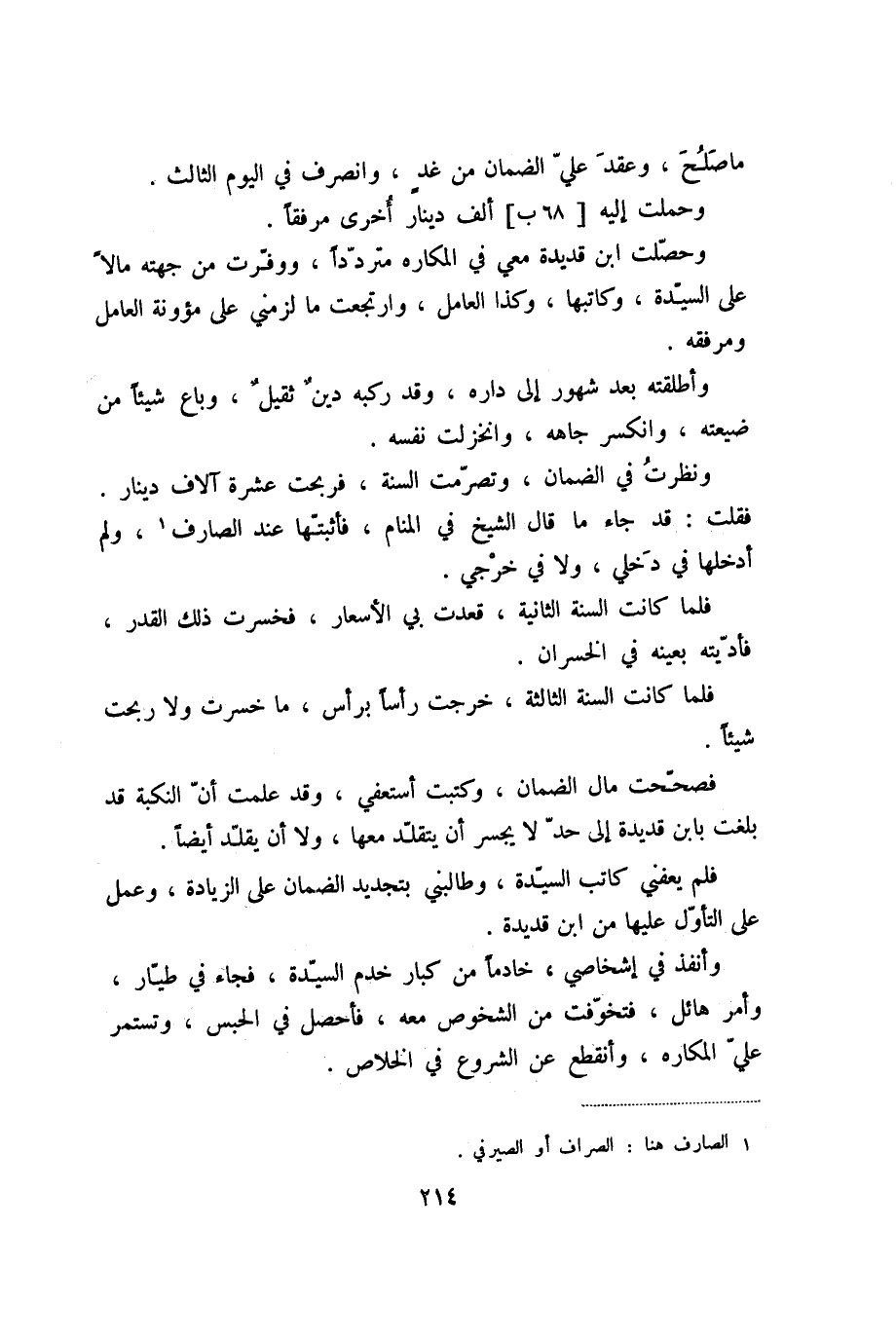 فقلت: قد جاء ما قال الشيخ في المنام، فأثبتّها عند الصارف «1» ، ولم أدخلها في دخلي، ولا في خرجي.