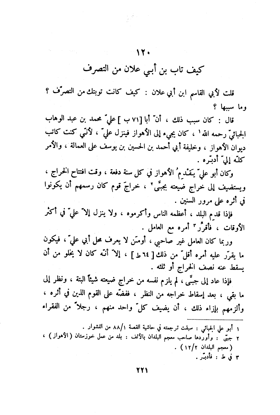 قال: كان سبب ذلك، أنّ أبا [71 ب] عليّ محمد بن عبد الوهاب الجبائيّ رحمه الله «1» ، كان يجيء إلى الأهواز فينزل عليّ، لأنّي كنت كاتب ديوان الأهواز، وخليفة أبي أحمد بن الحسين بن يوسف على العمالة، والأمر كلّه إليّ أدبّره.