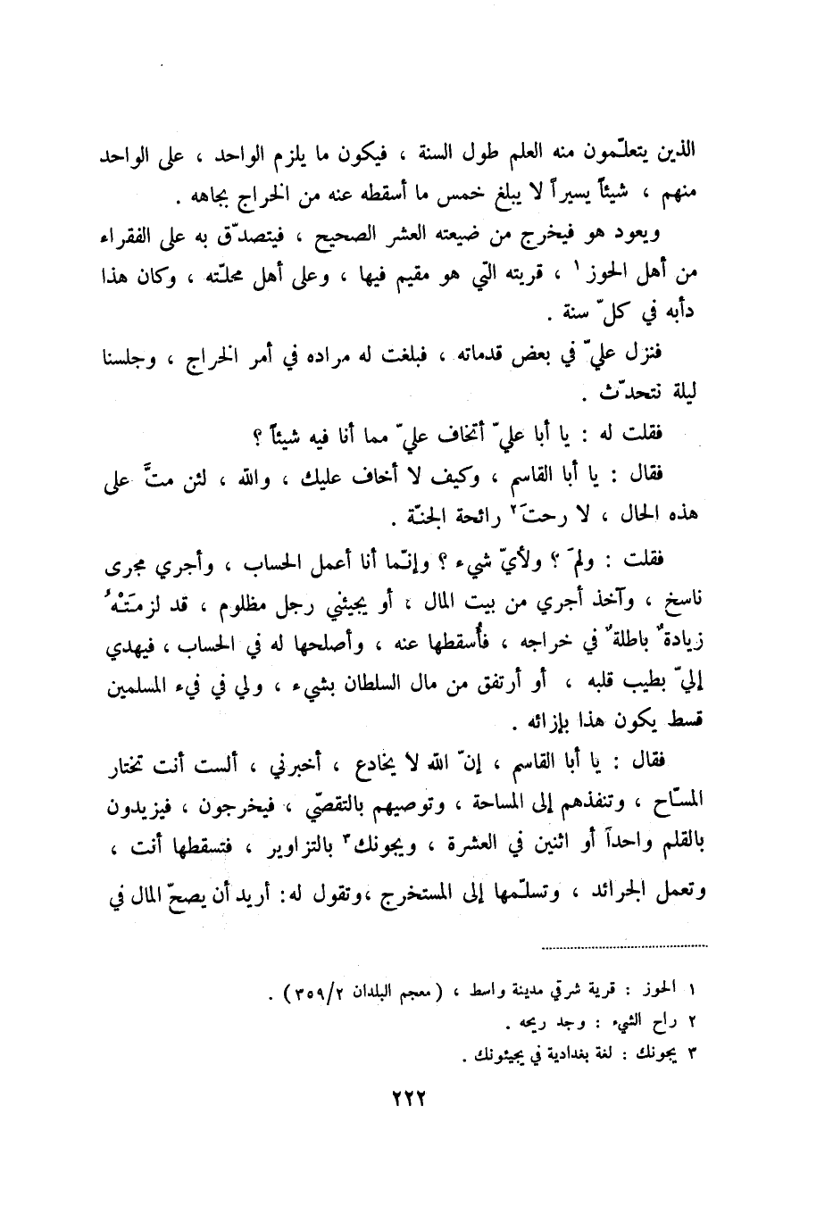 فقال: يا أبا القاسم، إنّ الله لا يخادع، أخبرني، ألست أنت تختار المسّاح، وتنفذهم إلى المساحة، وتوصيهم بالتقصّي، فيخرجون، فيزيدون بالقلم واحدا أو اثنين في العشرة، ويجونك «3» بالتزاوير، فتسقطها أنت، وتعمل الجرائد، وتسلّمها إلى المستخرج، وتقول له: أريد أن يصحّ المال في