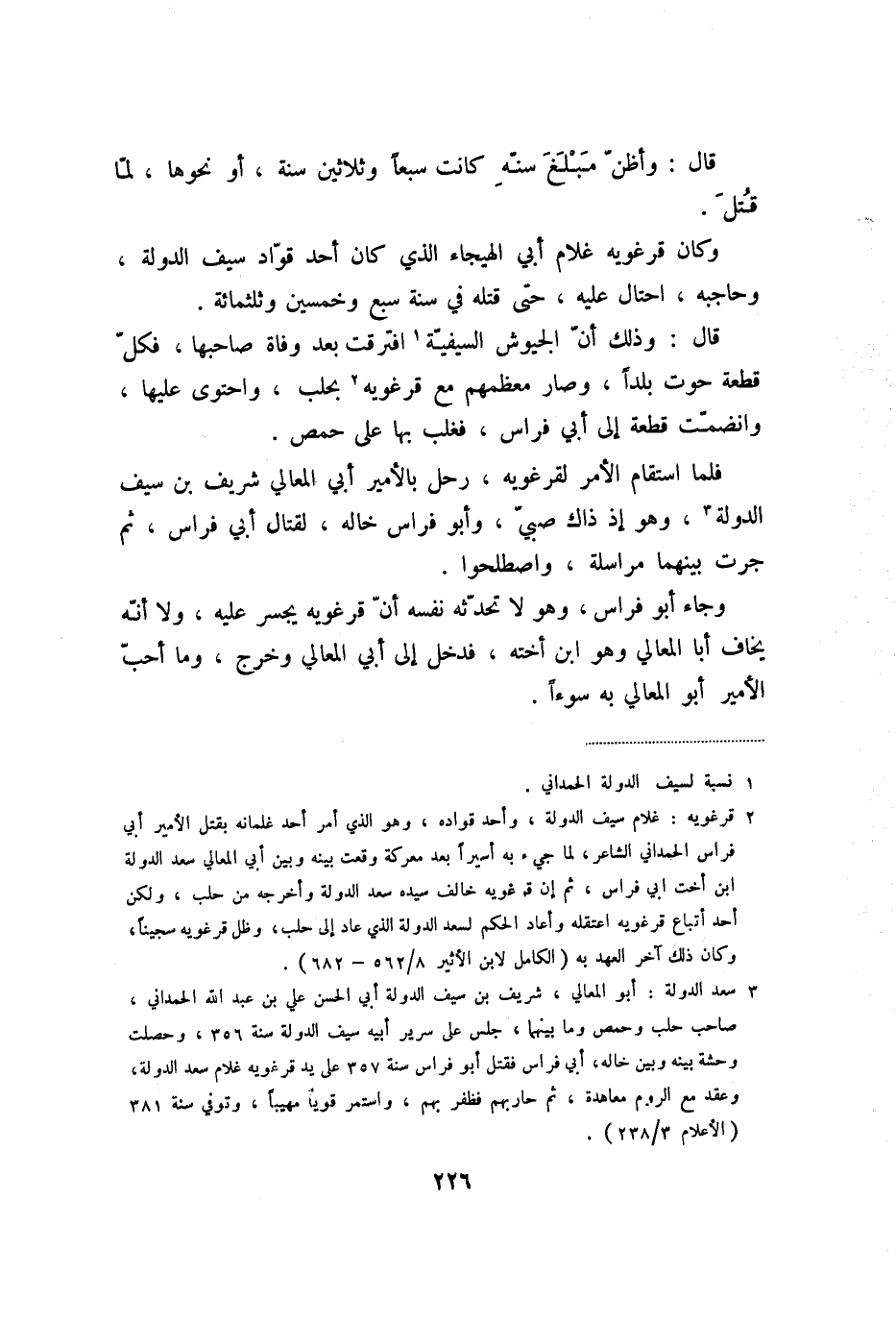 قال: وذلك أنّ الجيوش السيفيّة «1» افترقت بعد وفاة صاحبها، فكلّ قطعة حوت بلدا، وصار معظمهم مع قرغويه «2» بحلب، واحتوى عليها، وانضمّت قطعة إلى أبي فراس، فغلب بها على حمص.