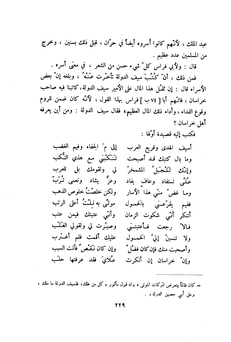 فمن ذلك، أنّ كتب سيف الدولة تأخّرت عنه، وبلغه إنّ بعض الأسراء قال: إن ثقل هذا المال على الأمير سيف الدولة، كاتبنا فيه صاحب خراسان، فاتّهم أبا [74 ب] فراس بهذا القول، لأنّه كان ضمن للروم وقوع الفداء، وأداء ذلك المال العظيم، فقال سيف الدولة: ومن أين يعرفه أهل خراسان؟